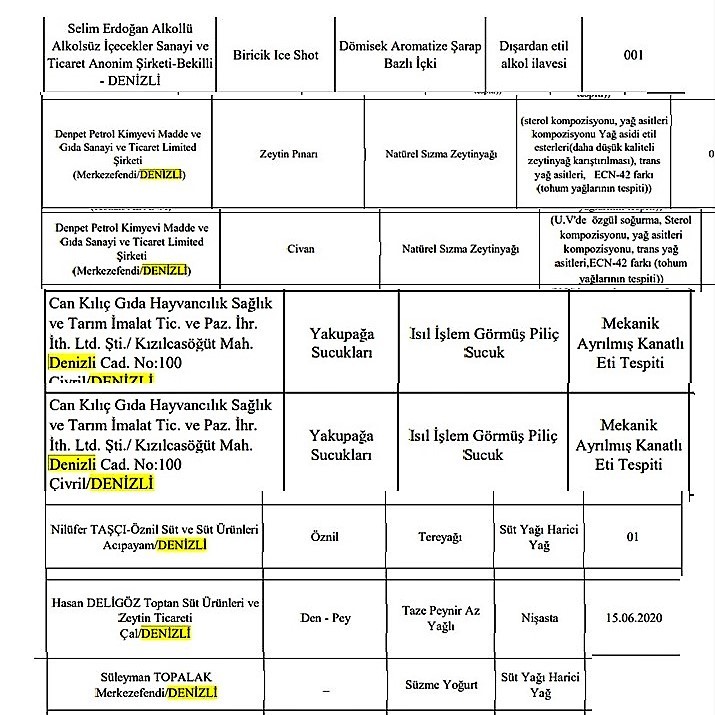 Tarım ve Orman Bakanlığı tarafından açıklanan taklit veya tağşiş yaptığı belirlenen firmalar listesinde Denizli’den 6 firma yer aldı. Listede yer alan Selim Erdoğan Alkollü Alkolsüz İçecekler Sanayi ve Ticaret Anonim Şirketine ait “Biricik Ice Shot” marka şarap bazlı içkide dışardan etil alkol ilavesi; Denpet Petrol Kimyevi Madde ve Gıda Sanayi ve Ticaret Limited Şirketine ait “Zeytin Pınarı” marka natürel sızma zeytinyağında daha düşük kaliteli zeytinyağı, trans yağ asitleri ve tohum yağlarının tespiti ile yine aynı firmaya ait “Civan” marka natürel sızma zeytinyağında tohum yağlarının tespiti; Can Kılıç Gıda Hayvancılık Sağlık ve Tarım İmalat Ticaret Şirketine ait “Yakupağa Sucukları” markalı 2 ayrı üründe mekanik ayrılmış kanatlı eti tespiti; Nilüfer Taşçı Öznil Süt ve Süt Ürünlerine ait “Öznil” marka tereyağında süt yağı harici yağ tespiti; Hasan Deligöz Süt Ürünleri ve Zeytin Ticaretine ait “Den – Pey” marka taze peynirde nişasta tespiti ve Süleyman Topalak Süt Ürünlerine ait süzme yoğurtta ise süt yağı harici yağ tespiti yapıldı.