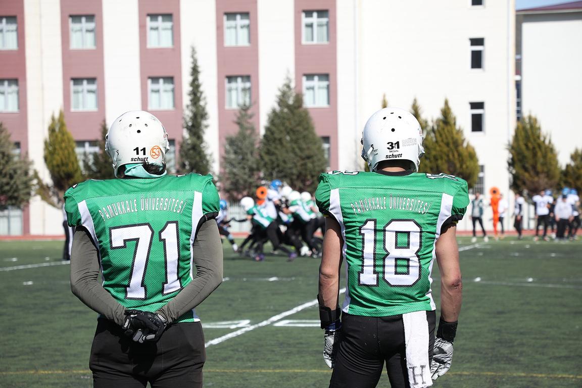Türkiye Üniversite Sporları Federasyonu (TÜSF) tarafından, ÜNİLİG kapsamında organize edilen Üniversiteler Arası Korumalı Futbol 1. Ligi B grubunda çeyrek finale yükselme mücadelesi veren Pamukkale Üniversitesi Korumalı Futbol Takımı, Pamukkale Horozları, grubun ilk müsabakasında Kütahya Dumlupınar Üniversitesi Korumalı Futbol Takımı ile karşı karşıya geldi. Grubundaki ilk müsabakasında 13-0 geriye düşen ev sahibi takım Pamukkale Horozları, zorlu geçen mücadelenin ardından, maçı 24-19 kazanmasını bildi. TÜSF Korumalı Futbol 1. Ligi B Grubunda Pamukkale Üniversitesi Korumalı Futbol Takımı’nın yanı sıra; Akdeniz Üniversitesi, Kütahya Dumlupınar Üniversitesi ve Muğla Sıtkı Koçman Üniversitesi Korumalı Futbol Takımları çeyrek finale yükselme mücadelesi veriyor.