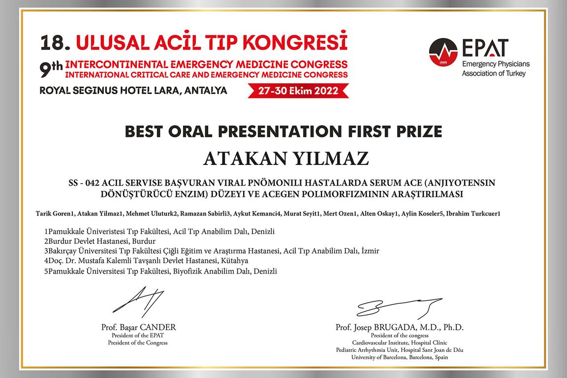 Pamukkale Üniversitesi Acil Tıp Anabilim Dalında Araştırma görevlilerinden Tarık Gören’in Prof. Dr. İbrahim Türkçüer danışmanlığında, PAÜ Bilimsel Araştırma Projeleri (BAP)’den destek alarak yaptığı ‘‘Acil Servise Başvuran Viral Pnömonili Hastalarda Serum ACE (Anjiyotensin Dönüştürücü Enzim) Düzeyi ve ACE Gen Polimorfizminin Araştırılması’’ tez çalışması, 18th National Emergency Medicine Congress & 9 th Intercontinental Emergency Medicine Congress & 9 th International Critical Care and Emergency Medicine Congress’te Doç. Dr. Atakan Yılmaz’ın da sunumu sonucu en iyi sözel bildiri ödülünü aldı.