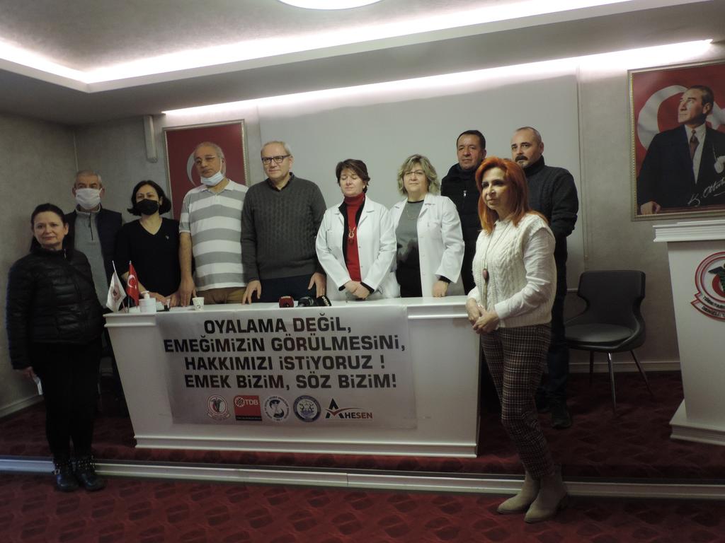 Koruyucu sağlık hizmetinin ne denli önemli olduğunun pandemi sürecinde yakıcı bir şekilde tecrübe edildiğini ifade eden Erbay, “Halkın sağlık hakkı mutlaka öncelenmelidir. Sağlık çalışanlarının talepleri ile halkın sağlık hakkı talebi birbirinden ayrılamaz. Bizler; sağlık emek meslek örgütleri bir mücadele programı başlatıyoruz. Hekimlerin ve diş hekimlerinin gelirlerinde düzenleme içeren ama; onlar arasında dahi eşitsizlik yaratmayan ve tüm sağlık çalışanlarını kapsayan bir yasa tasarısın ivedilikle meclisimize getirilmesini bekliyoruz. Tasarının mecliste getirilmemesi halinde 8 Şubat günü uyarı görevinde olacağımızı ve gerekirse de süresiz olarak göreve hazır bulunduğumuzu buradan kamuoyuna bildirmek istiyoruz” dedi.