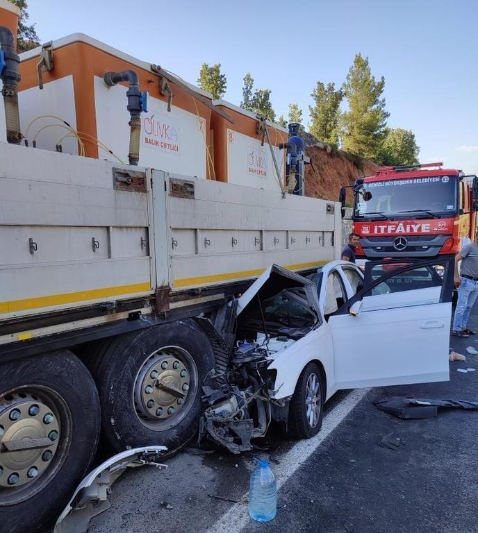 Denizli – Muğla karayolunda aynı yöne seyir halinde olan yavru balık yüklü tıra arkadan ok gibi saplanan otomobildeki 2 kişi yaralandı.