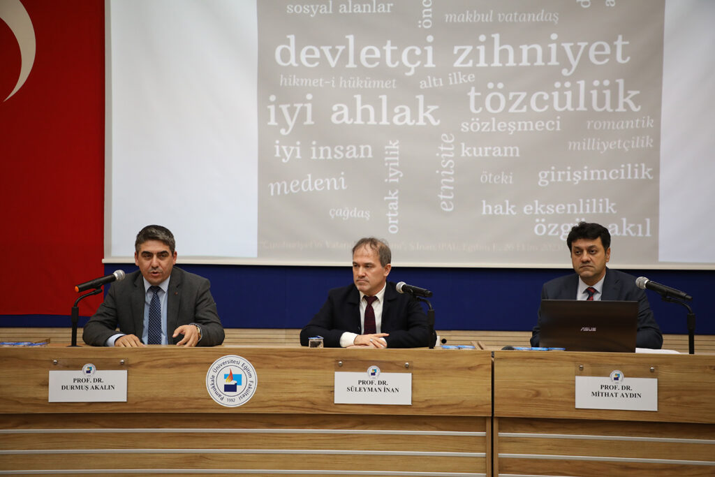 Moderatörlüğünü PAÜ Rektör Yardımcısı Prof. Dr. Durmuş Akalın’ın yaptığı “100. Yılında Cumhuriyet ve Atatürk” konulu panelde Prof. Dr. Süleyman İnan ve Prof. Dr. Mithat Aydın panelist olarak yer aldı. Öğretim üyelerinin ve çok sayıda öğrencinin katıldığı panelde açılış konuşmasını yapan Rektör Yardımcısı Prof. Dr. Durmuş Akalın: “Cumhuriyetimizin 100. yılında üniversite olarak çeşitli etkinlikler düzenliyoruz. Etkinliklerde amacımız siz öğrencilerimize Cumhuriyetimizin kolay kazanılmadığını ve onu korumak için birey olarak hepimize düşen sorumlulukların farkında olmanızı sağlamaktır.” dedi.