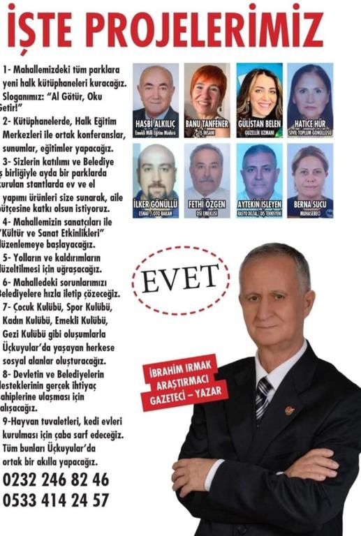 Haber Hürriyeti Gazetesi Genel Yayın Yönetmeni İbrahim Irmak, yıllar boyunca çevre ve yaşam hakları, hayvan hakları konusunda yazılar yazarak düşüncelerini paylaşan ve çözüm üreterek yollarını köşe yazılarında anlatmaktadır. Irmak, Karabağlar Üçkuyular Mahallesi Muhtar adayı olarak yine insana hizmeti seçti. Kendi deyimi ile: ‘’Benim bu topluma, bu insanlara bir gazeteci olarak bir sorumluluğum var, herkesin yapabileceği bir şey var.’’ diyerek yola çıkan usta gazeteci yıllardır süregelen aydınlanma yolunda ‘Sen de Bir Mum Yak’ Projesi altında ekibiyle kütüphaneler kuruyorlar. Irmak, şu anda 13 tane kütüphane kurduklarını ve ellerinde üç tane daha kütüphane açılabilecek kitap olduğundan bahsetti. Üçkuyular’da 11/2 sokaktaki Ali Erentürk İlkokulu’nun önünde bulunan ahşap kütüphanede 5500 tane kitabın olduğunu ve bütün mahalleye ‘Al Götür, Oku Getir’ Projesiyle insanlara katkı sağlamak istediğini belirtti. Şahsen benim de ziyaret etmekten keyif aldığım, yemyeşil parkın içinde doğaya ayak uydurmuş, renkli sandalyeler ve masası, doğa kokulu ahşap kütüphanesi, birkaç yıl öncesine nazaran hızla büyüyen muz ağacı ve hocamın sıcak sohbeti dumanı üstünde sıcak çayı ile hocam zaten bir muhtarın olabileceği katkıyı, belki fazlasını sağlıyor mahalle sakinlerine. Şu andaki konumu ve insana hizmet yolculuğunda eksik olan tek şey ‘Muhtarlık’ tabelası zaten. Sanata ve eğitime verdiği önemle birlikte, sanatçılar için de neler yapabileceğini düşünmüş ve mahallede kendi eserleri bulunan her türlü emeğin sergilenmesinde destek olacağını belirtti. Yazarlar için kitaplarının, eserlerinin tanıtımı için imza günleri düzenleyerek sanatçılara ve mahalleliye katkı olma projelerinden de bahsetti değerli hocam.