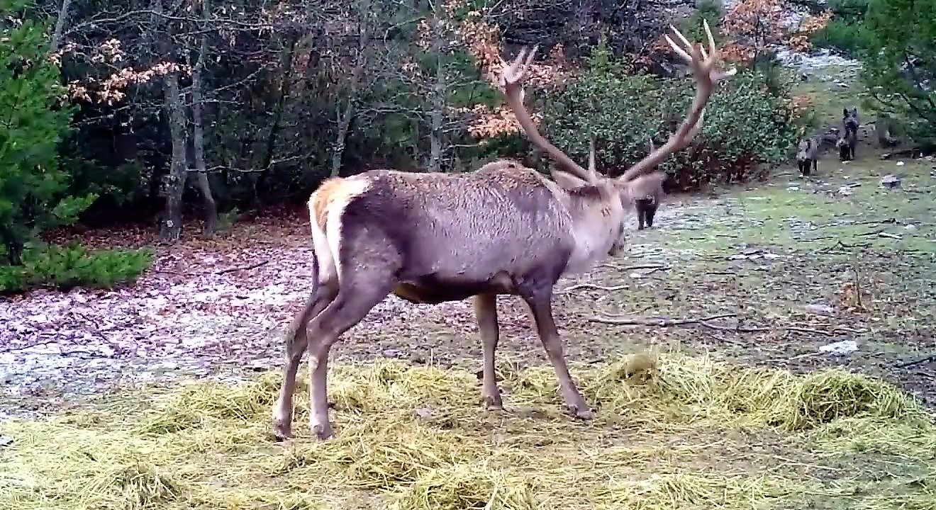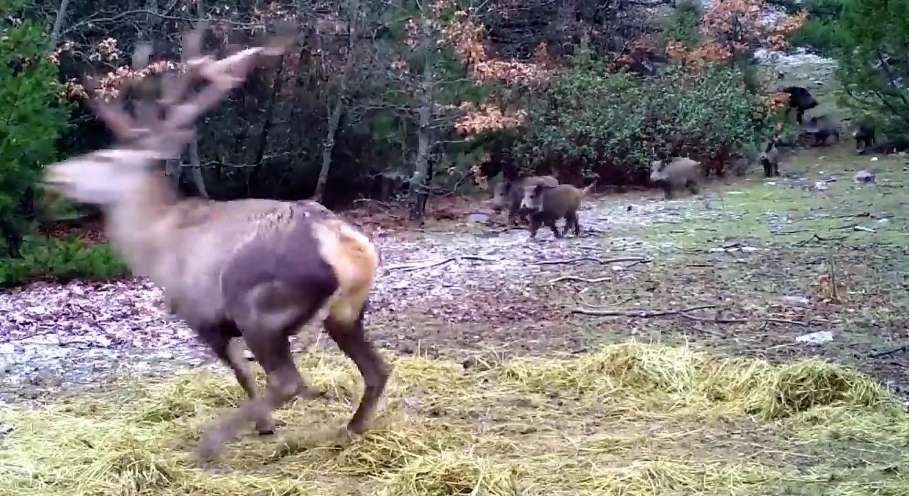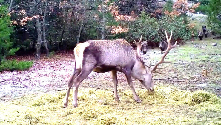 Son 10 yılın en soğuk ve yağışlı kış mevsimini geride bırakan Denizli’nin yüksek kesimlerinde biriken karların erimemesi nedeniyle, yaban hayatı yiyecek bulmakta halen güçlük çekiyor. Baharın ortalarına gelinmiş olmasına rağmen karlar eriyip taze otlar çıkmayınca, Doğa Koruma ve Milli Parklar (DKMP) Denizli Şube Müdürlüğü ekipleri tarafından Merkezefendi ilçesinde bulunan Karcı Dağı ve Çivril ilçesinde bulunan Akdağ’a yaban hayatının korunması için yem bırakılıyor. Yaban hayatı için yiyecek bulma sıkıntısının devam ettiği Karcı Dağı’nda kurulan fotokapanlara önceki gün ilginç bir görüntü yansıdır. DKMP Şube Müdürlüğü ekipleri tarafından bırakılan yemlerle karnını doyurmakta olan kızıl geyik, aç kalan domuz sürücünün tacizine uğradı. Kendisine doğru yaklaşan domuz sürüsünü görünce panikleyen kızıl geyik, yemeğini yarıda bırakarak kaçmak zorunda kaldı. Domuz sürüsünün kızıl geyiği kovaladığı anlar, fotokapanlar tarafından saniye saniye kaydedildi.