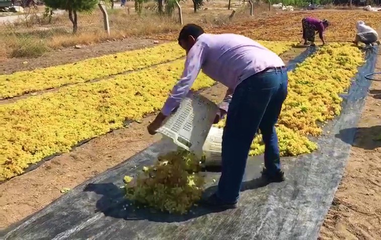 Üzümlerin bir bölümünü keserek yaş üzüm olarak sattıklarını belirten Üzüm üreticisi Raziye Akın, “Sergilerde üzümlerimiz kuruması için potas dediğimiz sıvı dökerek kurutuyoruz. Yaklaşık bir hafta da kuruyan üzümlerimizi savuruyoruz. Çuvallara doldurarak TARİŞ, TMO veya üzüm alıcısı şirketlere veriyoruz” dedi.
