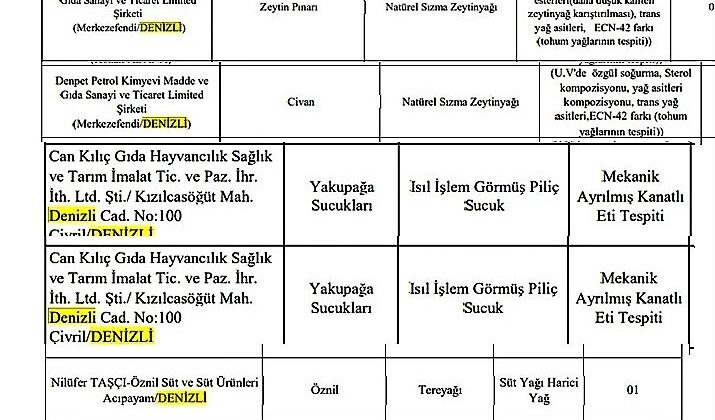 Tarım ve Orman Bakanlığı tarafından açıklanan taklit veya tağşiş yaptığı belirlenen firmalar listesinde Denizli’den 6 firma yer aldı. Listede yer alan Selim Erdoğan Alkollü Alkolsüz İçecekler Sanayi ve Ticaret Anonim Şirketine ait “Biricik Ice Shot” marka şarap bazlı içkide dışardan etil alkol ilavesi; Denpet Petrol Kimyevi Madde ve Gıda Sanayi ve Ticaret Limited Şirketine ait “Zeytin Pınarı” marka natürel sızma zeytinyağında daha düşük kaliteli zeytinyağı, trans yağ asitleri ve tohum yağlarının tespiti ile yine aynı firmaya ait “Civan” marka natürel sızma zeytinyağında tohum yağlarının tespiti; Can Kılıç Gıda Hayvancılık Sağlık ve Tarım İmalat Ticaret Şirketine ait “Yakupağa Sucukları” markalı 2 ayrı üründe mekanik ayrılmış kanatlı eti tespiti; Nilüfer Taşçı Öznil Süt ve Süt Ürünlerine ait “Öznil” marka tereyağında süt yağı harici yağ tespiti; Hasan Deligöz Süt Ürünleri ve Zeytin Ticaretine ait “Den – Pey” marka taze peynirde nişasta tespiti ve Süleyman Topalak Süt Ürünlerine ait süzme yoğurtta ise süt yağı harici yağ tespiti yapıldı.