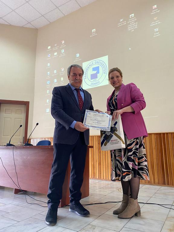 Soru cevap bölümünde sonra konuşmasını bitiren Öğr. Gör. Necmi Özdemir’e Yüksekokul Müdürü Doç. Dr. Gizem Karakan Günaydın tarafında günün anısına bir teşekkür belgesi taktim ederek; “Davetimizi kabul edip okulumuza gelerek bizleri onurlandıran, engin bilgi ve tecrübelerini bizlerle paylaşan Öğr. Gör. Necmi Özdemir hocamıza teşekkür ederiz” dedi.