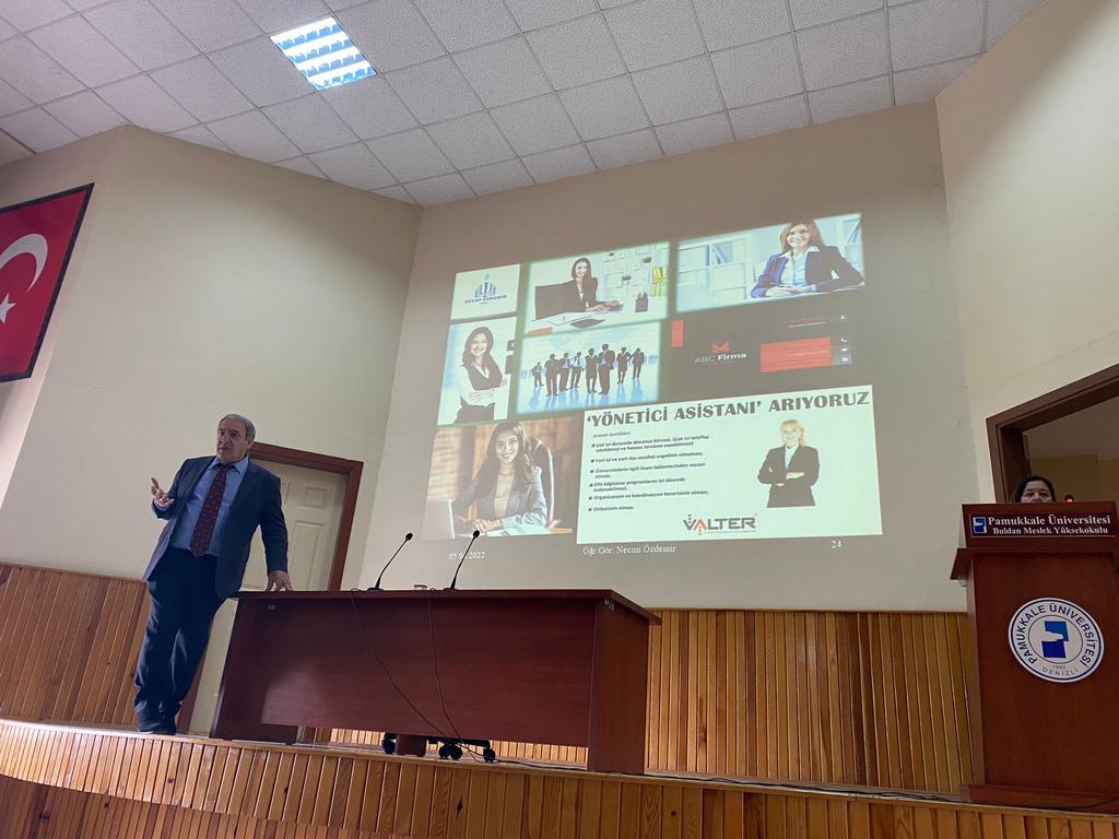 Sekreterlik konusunda da bilgiler aktaran Öğr. Gör. Özdemir; Sekreter kelimesi yerine Yönetici Asistanı kelimesini kullandığını belirterek; “Yönetici Asistanının önce bedensel temizliğine, giyiminde ki uyuma, konuşmalarına dikkat etmesi gerektiğini, bu konuda eğitimli olmasının şart olduğunu anlattı. Yönetici Asistanının mesleğini severek yapmasını, pozitif düşünmesini, şık giyinmesini bilen, mesleği ile ilgili her türlü eğitimi almış ve bu konuda bilgiye sahip olması gerektiğini, olaylara müdahale edebilen, problem çözücü, tertipli düzenli olması, yöneticisi ile programlar yapabilen, bu konuda görüşlerini söyleyebilen, Görgü, protokol kurallarını bilen ve uygulayan, nazik kibar bir kişiliğe sahip, mesleği ile ilgili yayınları takip eden, bolca okuyan, uyumlu ve modern olması gerekir. Gerek Büro Yöneticisi ve çalışanları gerekse Yönetici Asistanlarının; İmla kurallarını, Resmi Yazışma Kurallarını çok iyi bilmesi, her kurumun kendisine ait bir sayı kodu olduğunu bu sayı kodundan sonra sayının verilmesi gerekir” dedi.