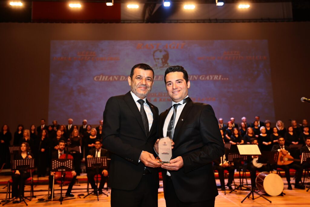 Başkan Çavuşoğlu burada yaptığı konuşmada, bu güzel Cumhuriyeti Türk milletine bırakan Gazi Mustafa Kemal Atatürk’ü anarken aynı zamanda fikirlerini yaşatıyor olabilmenin de çok büyük bir mutluluk kaynağı olduğunu söyledi. Başkan Çavuşoğlu, “Tüm dünyanın imrenerek baktığı bir lidere sahibiz. Bugün O liderin ebediyete irtihalinin 86. yıldönümünde birlikteyiz. Ama biz biliyoruz ki Ata’mızın bedeni aramızdan ayrılmış olsa dahi onun fikirleri, onun inançları, onun devrimleri sonsuza kadar bizlerle birlikte yaşamaya devam edecektir. Buradan Ata’mıza bir kez daha söz veriyoruz. ‘Devrimlerini sonsuza kadar yaşatacağımıza emin olabilirsin. Ata’m huzur içinde uyu. Bu kardeşlerin senin devrimlerine sonsuza kadar sahip çıkacak.” İfadelerini kullandı. Konuşmanın ardından Başkan Çavuşoğlu, Koro Şefi Çağdaş’a plaket verdi.
