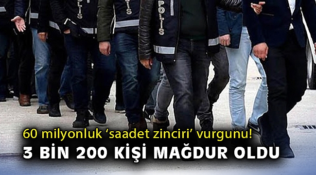 İzmir merkezli olarak 21 ilde gerçekleşen ve 83 kişinin gözaltına alındığı ‘saadet zinciri’ operasyonunun detayları belli oldu. Polis ekiplerinin yürüttüğü çalışmada, şu ana kadar 3 bin 200 kişinin mağdur edildiği ve dolandırıcıların en az en az 60 milyon lira haksız kazanç elde ettikleri tespit edildi.