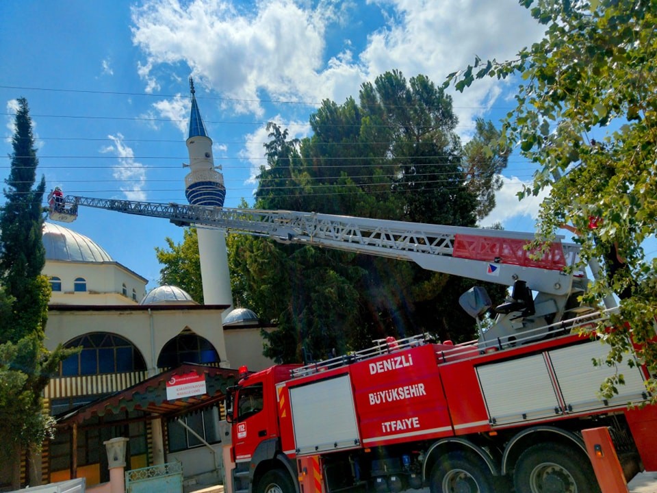 Acıpayam ilçesine bağlı Karahöyük Avşarı Mahallesi’nde bir caminin kubbesinde bulunan leyleğin uçamadığını fark eden vatandaşlar durumu itfaiye ekiplerine bildirdi. İhbar üzerine bölgeye gelen Denizli Büyükşehir Belediyesi İtfaiye Daire Başkanlığı ekipleri, kubbede mahsur kalan leyleğin kurtarılması için çalışma başlattı.