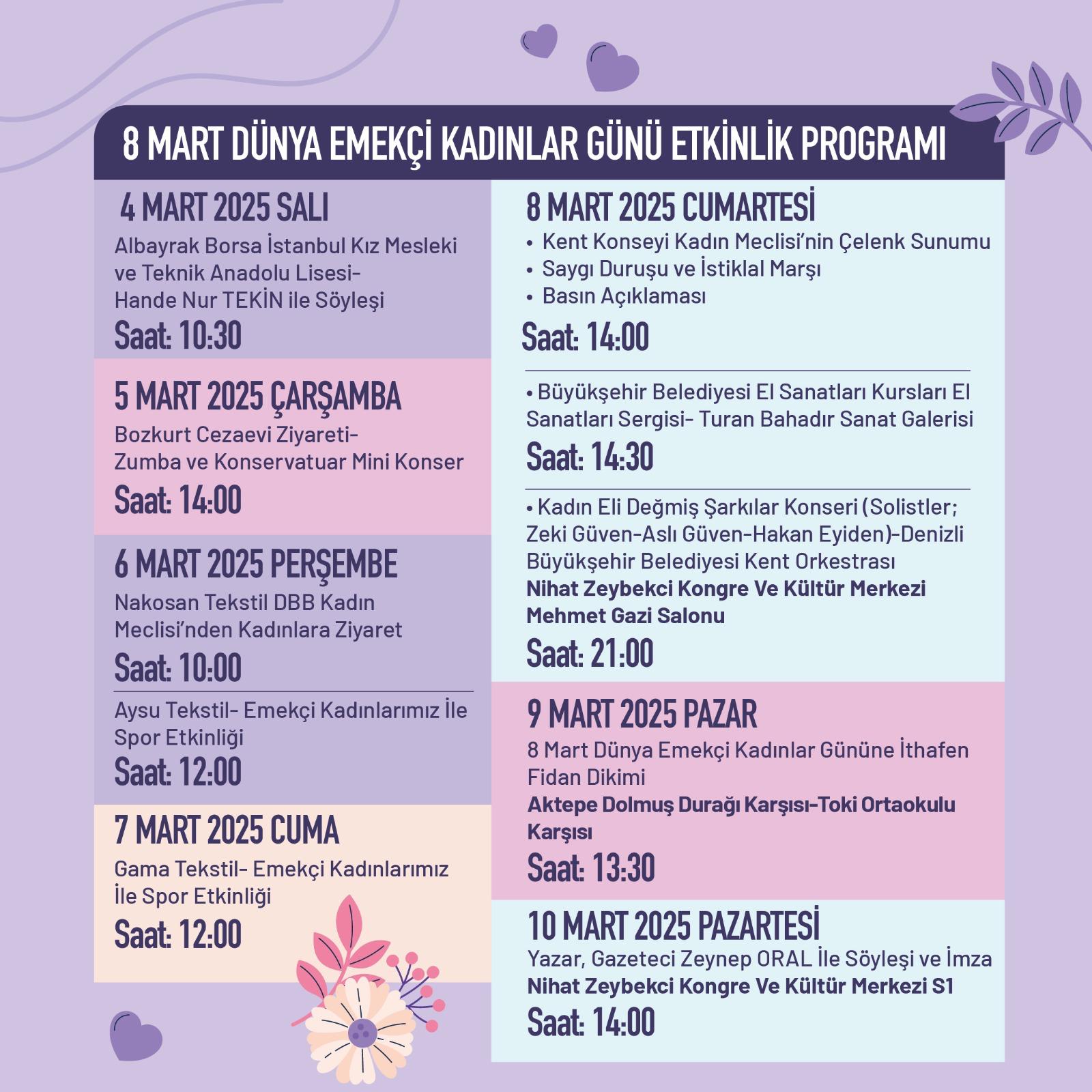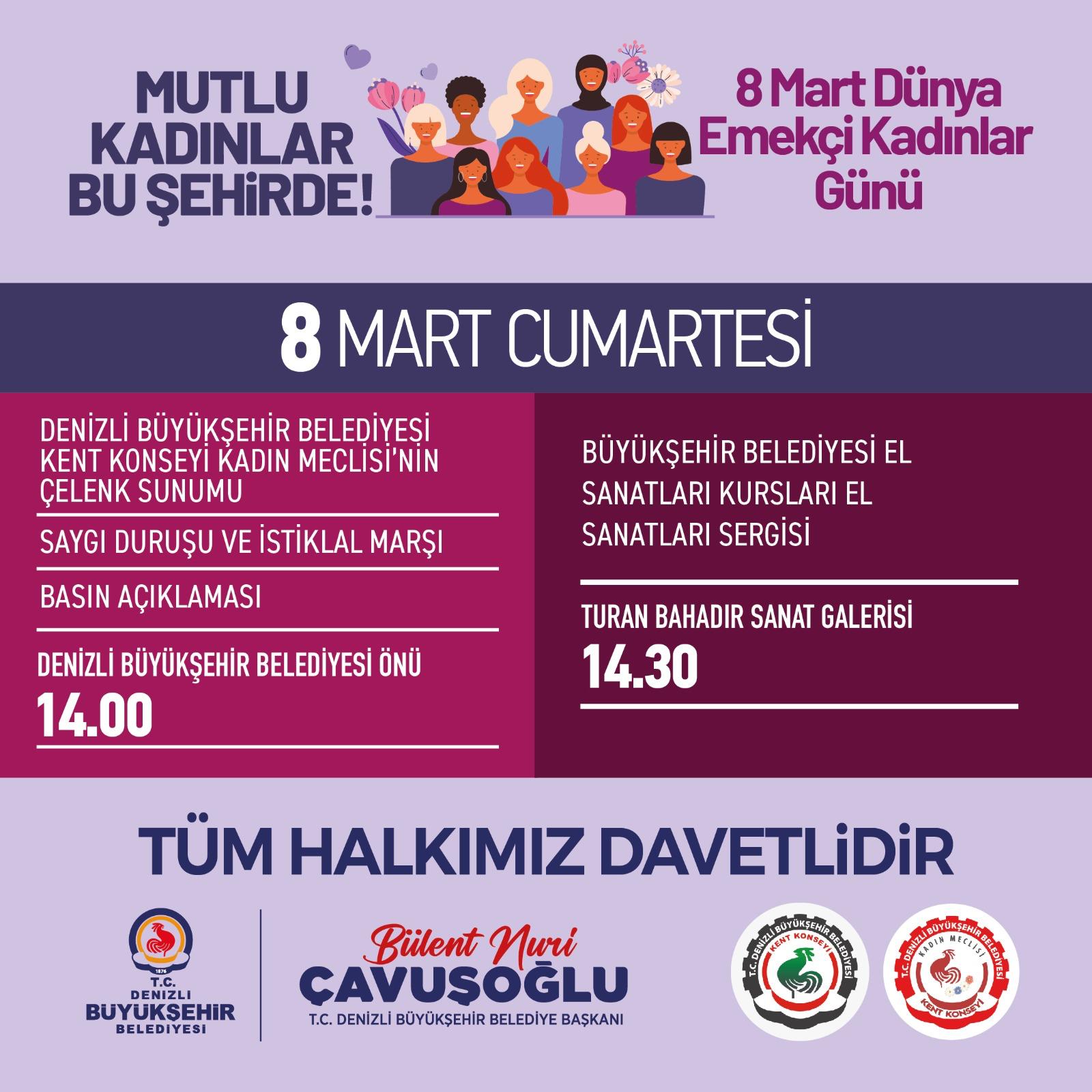 Denizli Büyükşehir Belediyesi Kent Konseyi Kadın Meclisi, 8 Mart Dünya Emekçi Kadınlar Günü’nü konser, dans, spor etkinlikleri, sergiler ve söyleşilerle kutluyor. Etkinlikler kapsamında gazeteci yazar Zeynep Oral Denizlili kadınlarla bir araya gelecek. Programın detayları haberimizde!