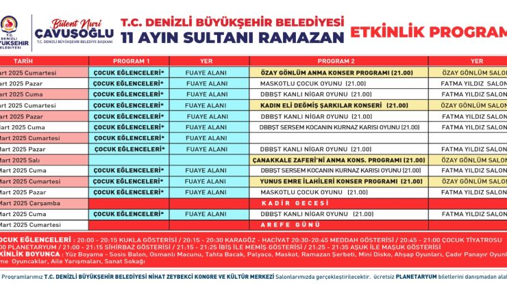 Her gün 7’den 70’e herkese hitap eden farklı etkinliklerin ücretsiz olarak yer aldığı Büyükşehir Belediyesinin ramazan ayı programlarına tüm Denizlililerin davetli olduğu belirtilirken, etkinliklerin detayına www.denizli.bel.tr adresinden ulaşılabiliyor.