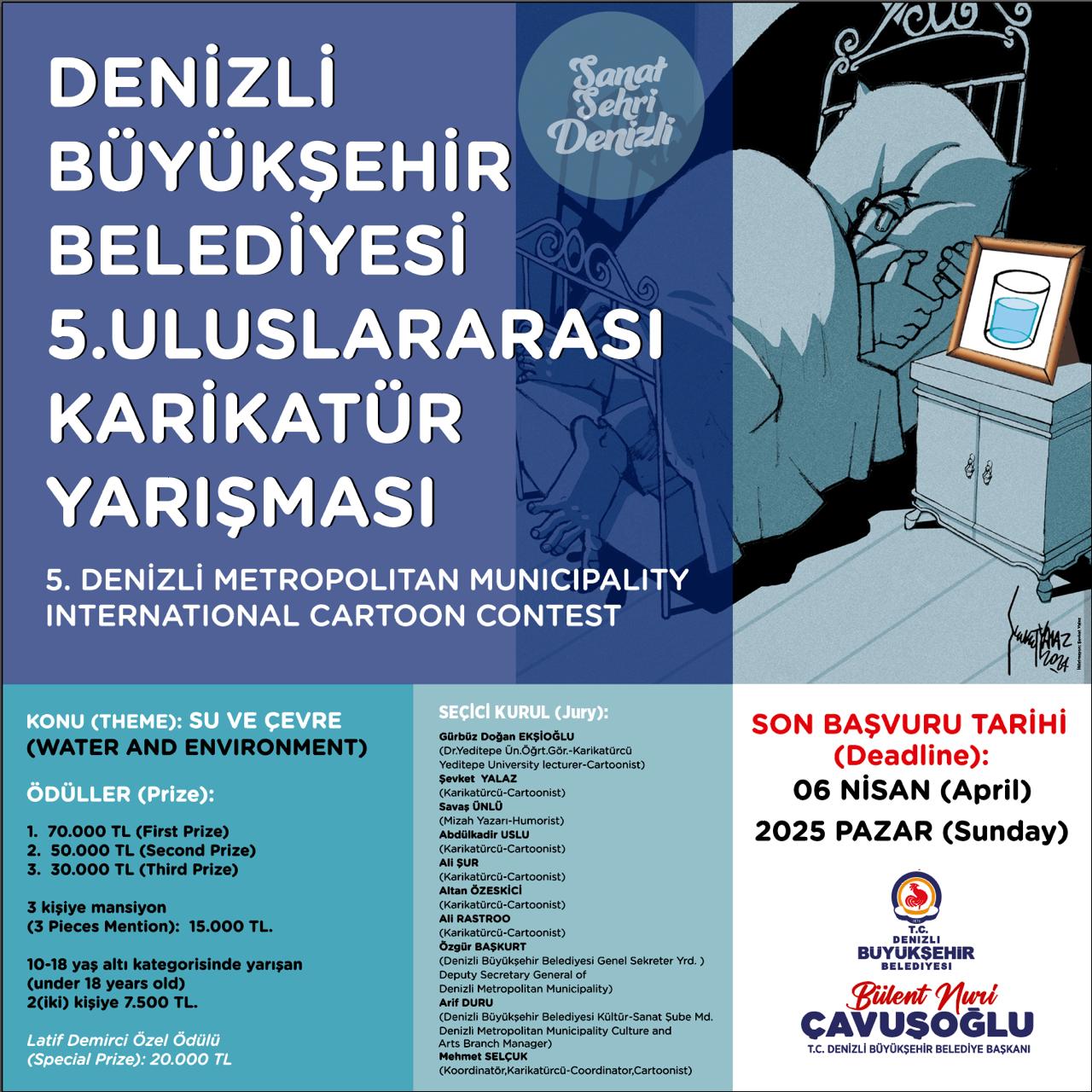İklim değişikliği, su kaynaklarının tükenmesi ve çevresel sorunlara dikkat çekmeyi amaçlayan yarışma, karikatür sanatının gücünü kullanarak toplumsal farkındalık oluşturmayı hedefliyor. Seçici kurulda dünyaca ünlü usta karikatüristler Gürbüz Doğan Ekşioğlu ve Şevket Yalaz’ın yanı sıra Türkiye’den ve yurt dışından usta karikatüristler yer alırken, yarışmada dereceye giren eserler Denizli Büyükşehir Belediyesi tarafından sergilenecek ve dijital albümde yayımlanacak.