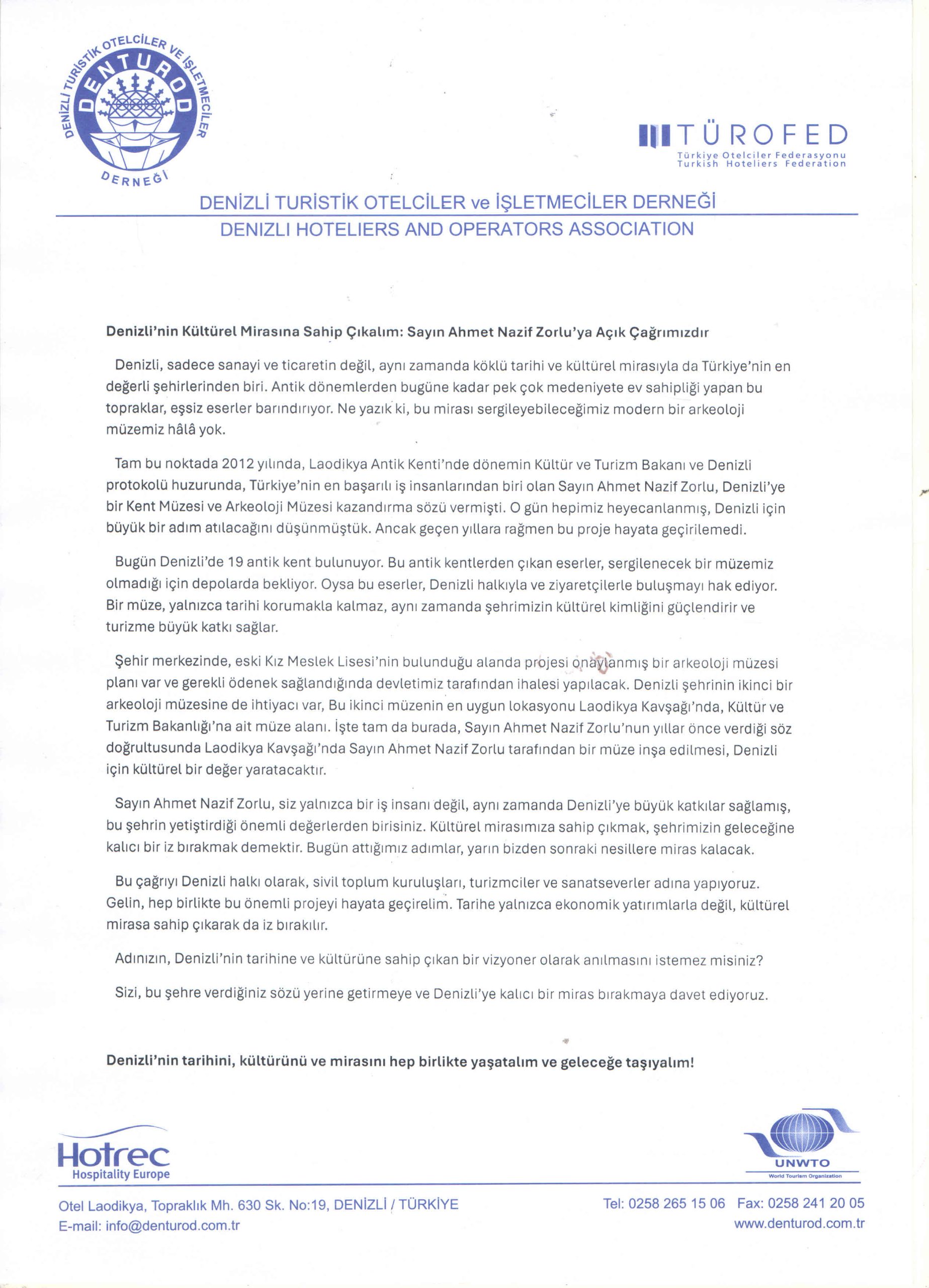 Bu çağrıyı Denizli halkı olarak, sivil toplum kuruluşları, turizmciler ve sanatseverler adına yapıyoruz. Gelin, hep birlikte bu önemli projeyi hayata geçirelim. Tarihe yalnızca ekonomik yatırımlarla değil, kültürel mirasa sahip çıkarak da iz bırakılır.