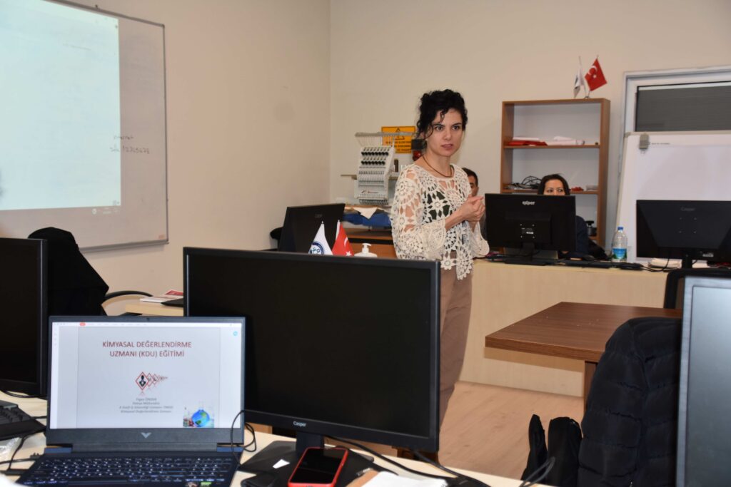 Eğitime dair bilgiler veren Aydos; “Çevre ve Şehircilik Bakanlığı ile çalışılan bir sistem. Kimyasalların daha bilinçli kullanılması ve kaydedilmesi ile ilgili bir sistem. Avrupa’da REACH Tüzüğü’nden uyarlanan bir sistem. Eğitime katılan arkadaşlar çalışılan kimyasalların değerlendirmelerini yapmayı öğrenecekler. Sanayinin gelişmiş olduğu bölgelerde bu belgeye daha çok ihtiyaç duyuluyor. Çevre ve Şehircilik Bakanlığı bu sistemi daha yeni oturtmaya çalışıyor. 2030’a kadar da bir süreci var. Ülkeye giriş ve çıkışı yapılan tüm kimyasalların verileri Bakanlığın sistemine yüklenecek. Denetlemesi de yapılmış olacak. Bu süreçte belge almak isteyen arkadaşları belgelendirip bunun üzerine KDU eğitimini kazandırıp Bakanlığın istediği sistemi kurmaya çalışıyoruz” dedi.