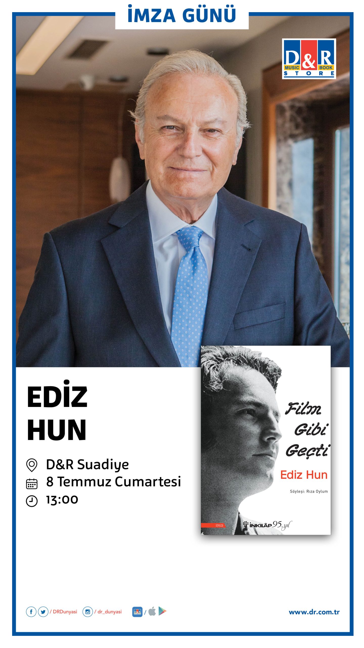 Kültür, sanat ve eğlence dünyasını tek çatı altında birleştiren D&R, geleneksel yazar okur buluşmaları kapsamında bu kez Türk sinemasının jönlerinden Ediz Hun’u ağırlıyor. Yeşilçam’ın unutulmaz ismi Ediz Hun’un doğumundan bugüne kadar olan yolculuğunu, periyotlar halinde aktardığı kitabı “Film Gibi Geçti”nin imza günü, 8 Temmuz saat 13:00’de D&R Suadiye mağazasında düzenlenecek.