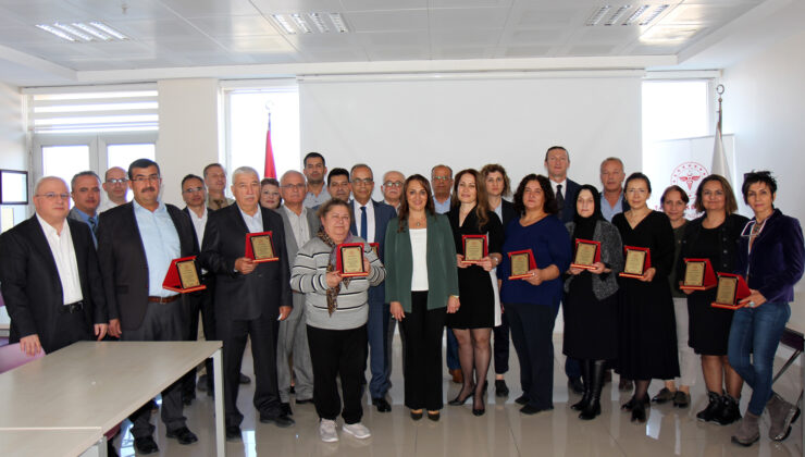 Konuşmasının ardından törene katılan ve emekliye ayrılan personele tek tek söz veren Öztürk, emeklilik planları üzerine kendileri ile sohbet etti. Daha sonra plaket takdim törenine geçilerek İl Sağlık Müdürlüğünde Veri Hazırlama Kontrol İşletmeni olarak görev yapan; Nergis Gürol, Ercan Koldemir, Servinaz Ceylan, Fatma Sevtap Balkan, Sağlık Memuru olarak görev yapan; Adil Fiyakalı, Tahsin Çağlayan, Hemşireler; Hatice Gülez Bozbek, Gülten Uygun, Ebe Safinaz Gözen, Elektronik Mühendisi Kamuran Varlıker, Teknisyen Recep Zeybek, Ayniyat Saymanı Nuri Söylemezo ve Berber Cemil Özkaya’ya plaketleri İl Sağlık Müdürü Uz. Dr. Berna Öztürk tarafından takdim edildi. Geçirdikleri sağlık sorunları nedeniyle törene katılamayanların plaketlerini ise VHKİ Elif Yanmaz adına halası Ayşe Karaca ve VHKİ Gökhan Güler adına da babası Cengiz Güler teslim aldı. Fatma TUNÇER
