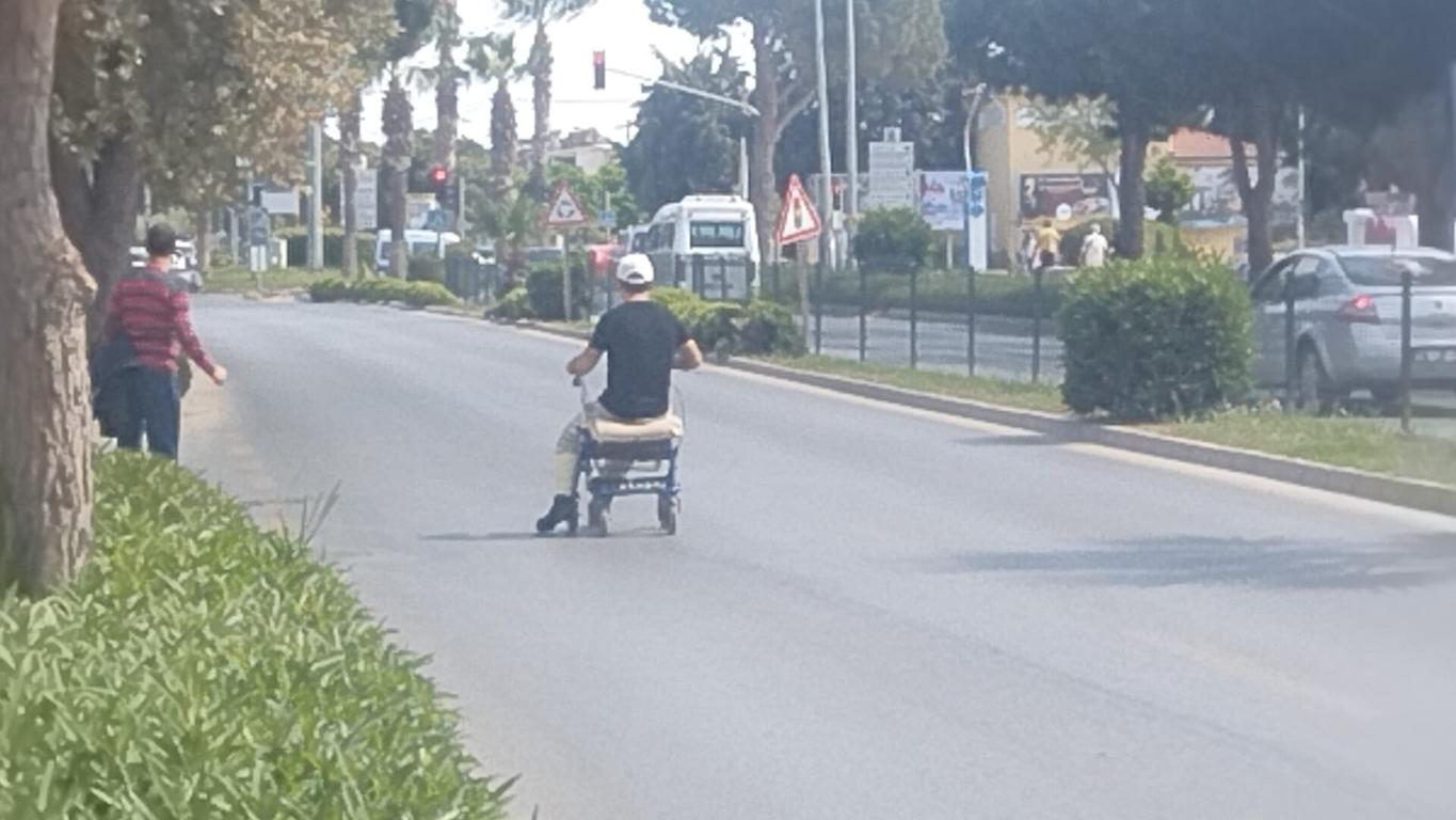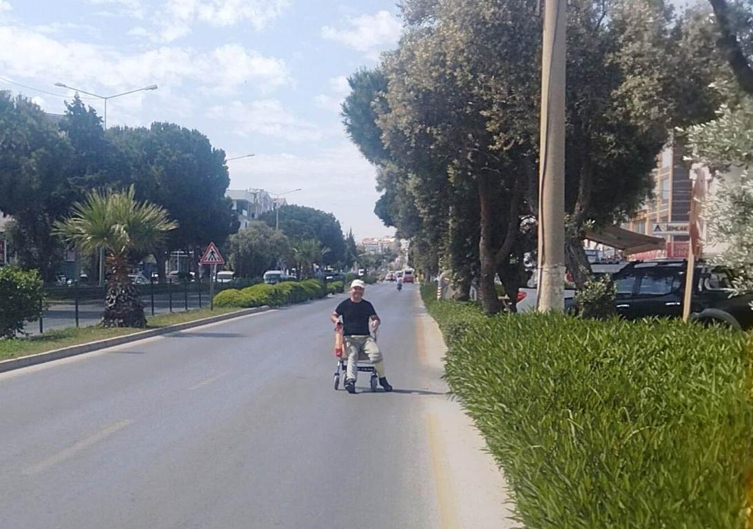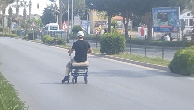 Aydın’ın Didim ilçesinde ayağı alçılı bir vatandaş, engelli arabasına ters binip akan trafikte kimseye aldırış etmeden ilerledi. Kendisini görüntüleyen vatandaşa “Akşama haberlerde çıkarız değil mi” dedi.