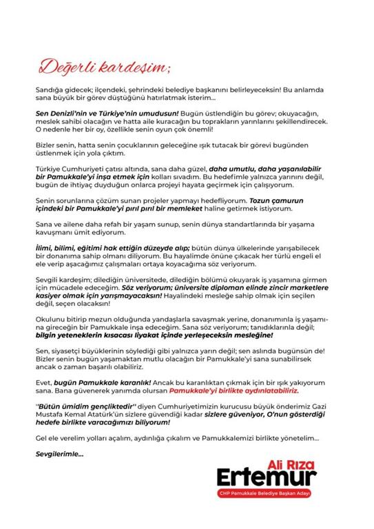 Cumhuriyet Halk Partisi (CHP) Pamukkale Belediye Başkan Adayı Ali Rıza Ertemur, seçimlere kısa bir süre kala gençlere yazdığı özel bir mektup dağıtarak çağrıda bulundu. Ertemur mektubunda, gençlere büyük bir görev düştüğünü belirterek; “Sen Denizli'nin ve Türkiye'nin umudusun! Gel ele verelim yolları açalım, aydınlığa çıkalım ve Pamukkale’mizi birlikte yönetelim” dedi.
