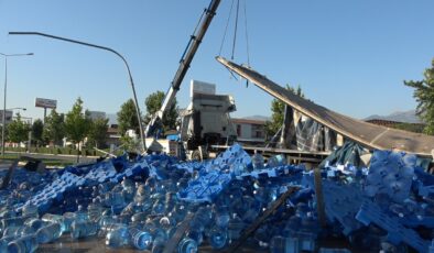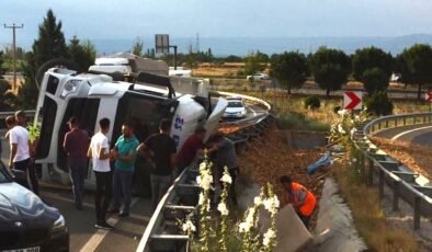 HAFRİYAT KAMYONU DEVRİLDİ, TONLARCA TALAŞ YOLA DÖKÜLDÜ