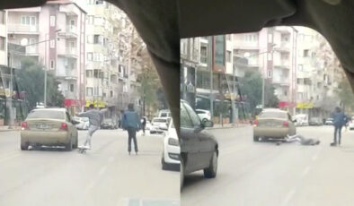 OTOMOBİLE TUTUNAN KAYKAYLI GENÇ AZ DAHA CANINDAN OLUYORDU