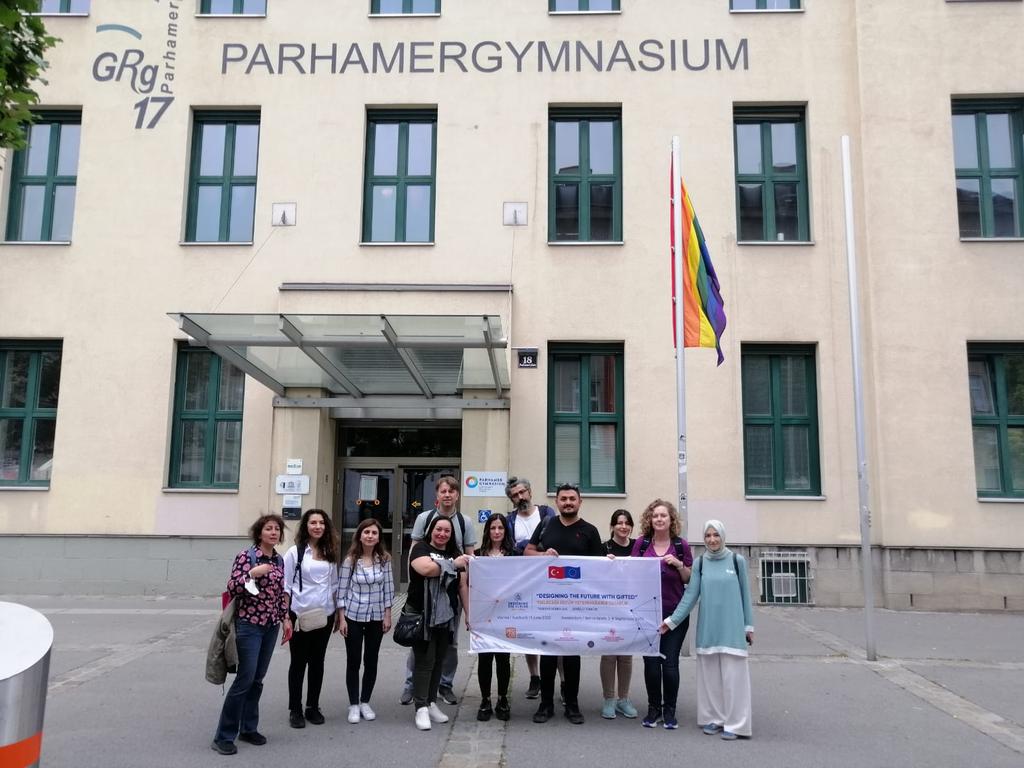 Proje kapsamında 10 öğretmen ve 2 idareci, Avusturya’nın Viyana kentinde faaliyet gösteren European Schoolnet bünyesine dahil eğitim kurumunda, “Geleceğin Sınıfları İçin İnteraktif Teknolojiler” eğitimini uzman eğitmenler rehberliğinde toplam 6 gün 35 saatlik eğitici eğitimi ile gerçekleştirmişlerdir.Eğitimin ilk gününde özel yetenekli bireyleri tanıma, ayırt edici özelliklerini tanımlama ve Dixit oyunu ile duygu analizi yapma konularında bilgiler veren eğitmen Istvan Szabo; eğitimin ilerleyen günlerinde üstün yetenekli bireyler için uygulanan eğitim sistemleri, özel yetenekli çocuklarda öğrenme zorlukları, öğretmenler için eğitim teknoloji standartlarını belirleme ( EdModa Eğitim uygulamasına giriş ve ders içeriği üretme/ Lyricstraining uygulaması), eğitimsel amaçlar için “Bloom’s Taksonomi” yöntemi ve geleceğin sınıflarının ortak özellikleri gibi konuları ele almıştır. Eğitimler sonrası etkinlikler düzenleyen 12 öğretmen gruplara ayrılarak bilişsel, duyuşsal ve psikomotor özelliklere sahip üstün yetenekli öğrencilerin özelliklerini belirleme ve bunlara uygun çalışma yapma üzerine grup çalışmalarına katılmışlardır. Eğitimin son 3 gününde ise üstün yetenekli eğitiminde müfredat modelleri (proje, zihin haritası, yaparak öğrenme), farklılaştırılmış- zenginleştirilmiş öğretim modelleri ve arasındaki farklar, eğitim teknolojilerinde uygulanan “codenames” uygulaması, öğretmenleri 21.Yüzyıl becerilerine hazırlama, üstün yetenekli bireylerde kaygı ve stres konuları ,kaygı ve stresi azaltacak etkinlikler, parlak ve üstün yetenekli bireyler arasındaki farklar, mükemmelliyetçilik (olumlu-olumsuz yönleri) Google Classroom uygulaması, nasıl uygulanacağı ve uygulama sınıfının nasıl kurulacağı eğitimleri gerçekleştirilmiştir. Teorik eğitimlerin yanısıra 6 günlük eğitim sürecinde ÜY-BİLSEM okulu öğretmenleri Viyana’da aktif eğitim veren ve üstün yetenekli bireylere yönelik çalışmalar yapan “Parhamergymnasium” ve “Hernalsergymnasium/Geblergasse” uygulama okullarına ziyaretlerde bulunmuşlardır. Yetenek geliştirme merkezleri ziyareti ile katılımcılar, merkezlerin ne tür materyaller hazırladıkları ve nasıl planlama yaptıkları hakkında bilgi sahibi olmuşlar böylece öğretmenler, özel yetenekli bireylere uygulanan farklı yöntem, materyal ve zenginleştirilmiş ders içeriklerini gözlemleme imkânı bulmuşlardır. Ayrıca ÜY-BİLSEM okulu öğretmenleri Viyana’da Doğa Tarihi Müzesini, Hofburg Sarayı ve Opera Binasını, Viyana Sanat Tarihi Müzesini, Sigmund Freund ve Mozart Evi Müzelerini ve Müzik ve Performans Sanatları Üniversitesi ile Viyana Tıp Üniversitesini ziyaret etme imkanı bulmuşlardır. Katılımcılar Viyana’daki eğitimin tamamlanmasının ardından Türkiye Viyana Büyükelçiliği’ne ziyaret gerçekleştirmiş, Büyükelçi Ozan Ceyhun’a ve Büyükelçilik Eğitim Müşaviri Doç. Dr. Yusuf Yıldız’a yürütülmekte olan proje hakkında bilgilendirmede bulunmuşlardır.