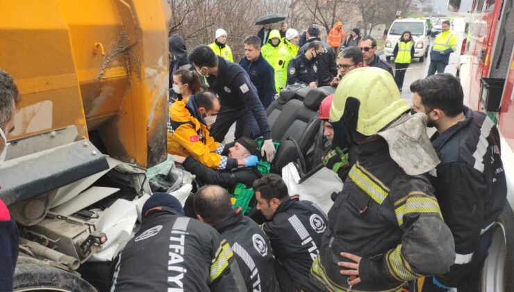 Kağıt gibi ezilen arabada yaralı çıkan çiftin, hastanede tedavilerinin devam ettiği öğrenildi.