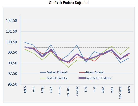 Türkiye Hazır Beton Birliği (THBB), her ay merakla beklenen inşaat ile bağlantılı imalat ve hizmet sektörlerindeki mevcut durum ile beklenen gelişmeleri gösteren “Hazır Beton Endeksi” 2025 Şubat Ayı Raporu’nu açıkladı. Ocak ayında oldukça gerileyen Faaliyet Endeksi şubat ayında yükselmiş görünse de tüm endeksler içinde en düşük seviyedeki endeks olmuştur. Beklenti Endeksi hariç tüm endeksler geçen yılın aynı ayına göre azalırken en çok düşüş Faaliyet Endeksi’nde görülmüştür.