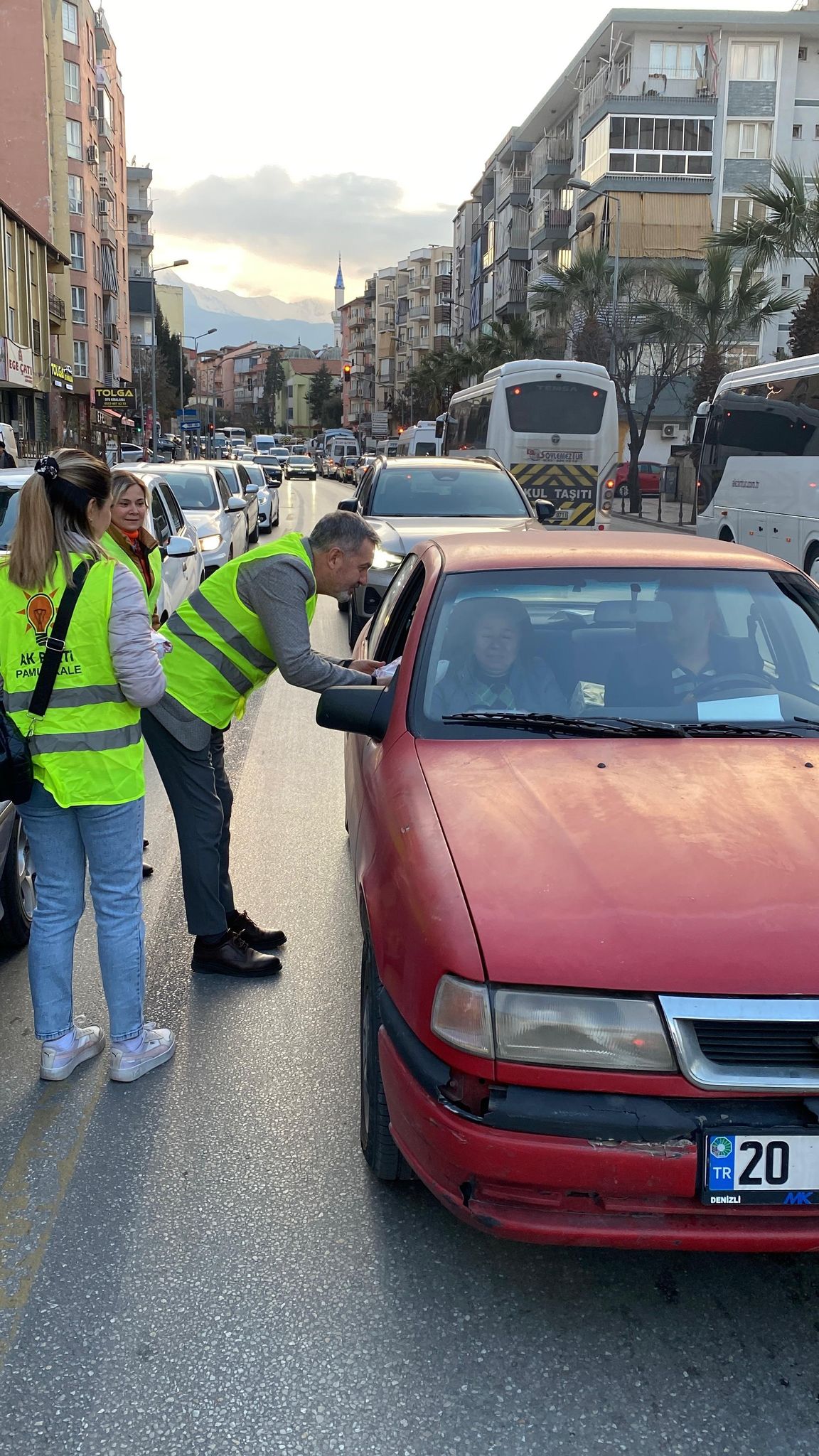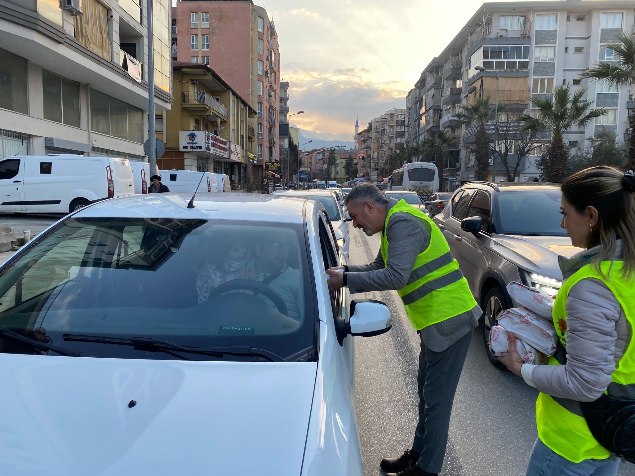 Denizli'de AK Parti Pamukkale İlçe Başkanı Osman Özpek, "İftara 5 Kala Projesi" kapsamında trafik yoğunluğunda yolda kalan vatandaşlara iftarlık paketi dağıttı. Hurma, su, meyve suyu ve sandviç içeren paketler, iftar saatinde trafik ışıklarında bekleyen araçlara sunuldu. Başkan Özpek, Ramazan ayının manevi atmosferini yaşatmak ve paylaşma kültürünü güçlendirmek amacıyla bu projeyi Ramazan sonuna kadar sürdüreceklerini belirtti.
