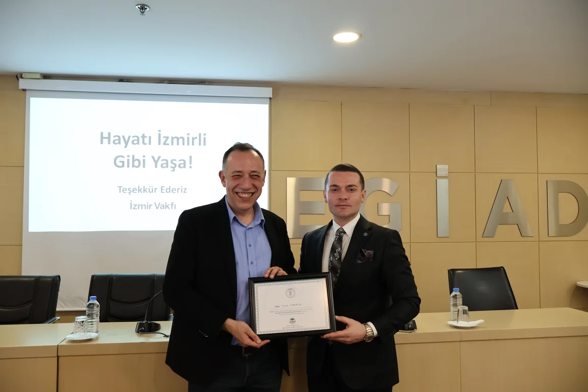 İzmir Vakfı Genel Müdürü Deniz Karaca, İzmir’in kent kimliği ve gelecekteki potansiyeli üzerine önemli bilgiler paylaştı. “İzmir Kent Kimliği” başlıklı sunumunda, kentin tarihi, kültürel ve ticari değerlerine vurgu yaparak İzmir’in sahip olduğu zengin mirasın altını çizdi. Şehrin algısını güçlendirmek amacıyla yaşanabilirlik, iş ve yatırım, eğitim, sağlık, kültür ve miras, sürdürülebilirlik, ulaşım, markalaşma ve yönetişim gibi temel kavramları ele alan Karaca, İzmir’in gelişimi için atılması gereken adımları sıraladı. “Başka şehirlere ilham kaynağı olan İzmir’in, iyi yaşam merkezi haline gelmesini hedefliyoruz. Hayatı İzmirli gibi yaşamak gerekiyor. İzmir, antik çağlardan bu yana ticaretin, sanatın ve yenilikçiliğin merkezi olmuş; hoşgörüsü ve kültürel çeşitliliği ile öne çıkan bir şehirdir. Bu mirası geleceğe taşımak hepimizin sorumluluğudur.” dedi. Seminer, Deniz Karaca’nın sunumu ve genç iş insanlarının sorularını yanıtlamasıyla tamamlandı. Etkinliğin sonunda, EGİAD Sakız Ağacı Korusu Projesi kapsamında Karaca adına bağışlanan sakız fidanı sertifikası kendisine takdim edildi.