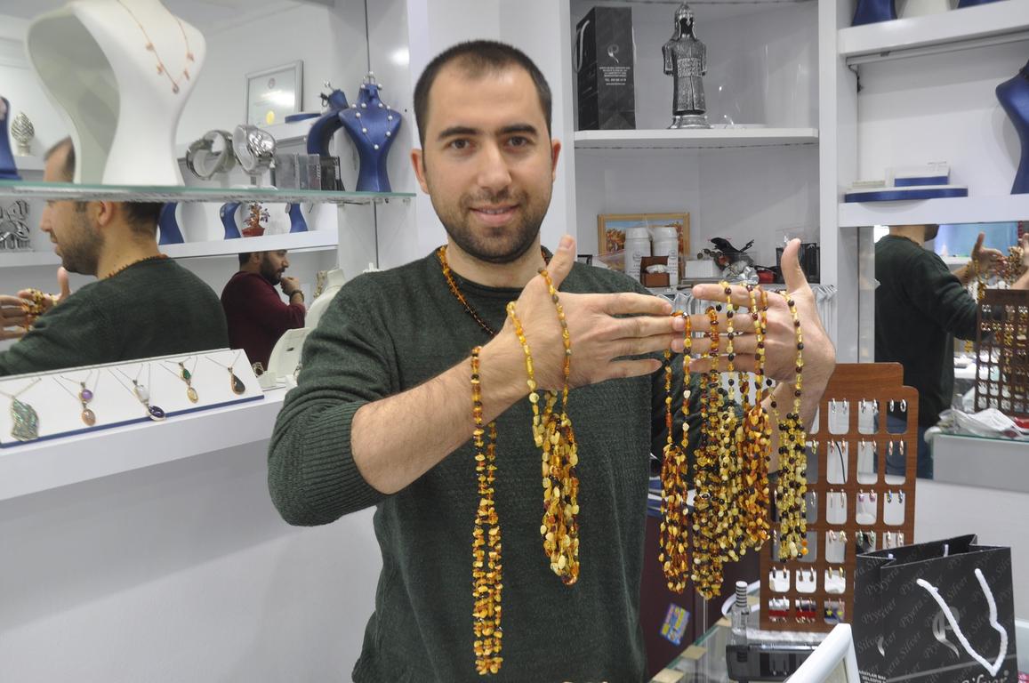 Bayramyeri Belediye Çarşısında Gümüşçülük yapan Kerim Koç, son yıllarda kehribar ürünlere yoğun talep olduğundan söz ederek, bunda bağışıklığa iyi geldiği düşüncesiyle vatandaşların ilgi gösterdiğini dile getirdi. Kehribarın ağaçlardan akan reçine olduğundan söz eden Koç, “Ağaçlar yarıldığında ya da yara aldığında kendilerini doğal yollardan tedavi etmek için reçine dediğimiz sıvıyı salgılar. Bu sıvı ağacın özüyle beraber toprağa düşüp 15-20 milyon yıllık bir süreçten geçtikten sonra taşlaşıp maden haline gelir. Dolaysıyla gerek toprağın gerek ağacın içindeki mineral ve akmanın kendi özü hepsi birleşip doğal bir antibiyotik özelliği olan kehribar oluşur. Kehribar Baltık ülkelerinde daha çok oluyor. Türkiye’de yeni keşfedilen Bayburt civarında bulunuyor” açıklamasında bulundu. Kehribardan pek çok ürün yapıldığından söz eden Koç, “Tesbih, kolye, bileklik, yüzük gibi ürünler elde ediliyor. Son zamanlarda vatandaşların yoğun ilgisi var. Sıhhat için vücut bağışıklığını arttırıyor. Çocukların diş çıkarma döneminde ateşlenmeyi önleyen özelliği var. Troid, Guatr, bademcik, üst solunum yolu rahatsızlıklarına faydası var. Şu dönemde özellikle bağışıklığı güçlendirdiği için tavsiye ediyoruz” dedi.