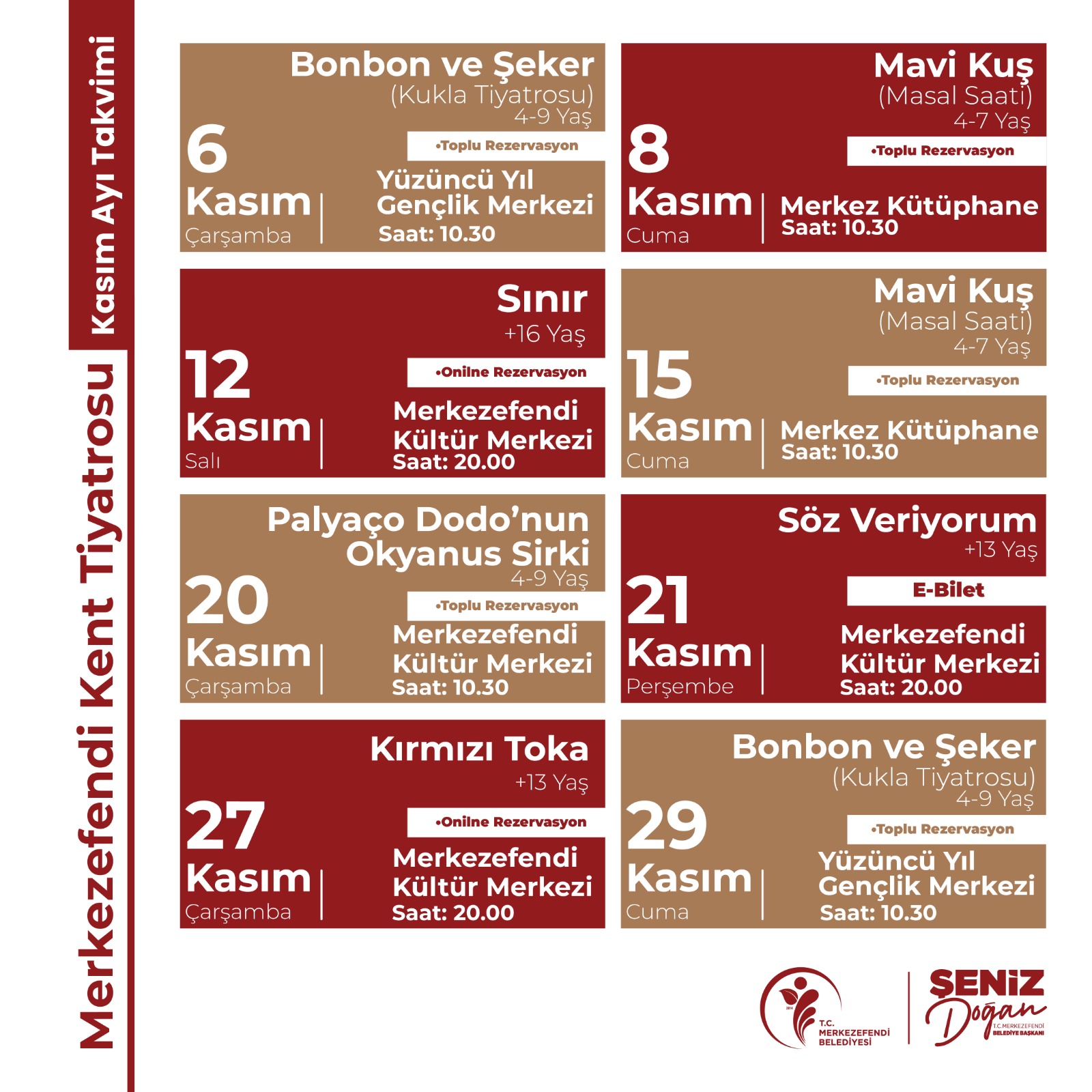 Merkezefendi Kent Tiyatrosu’nun Kasım ayı oyun takvimi açıklandı. Tiyatro ekibi, 6-8-12-15-20-21-27-29 Kasım tarihlerinde sahne alacak.