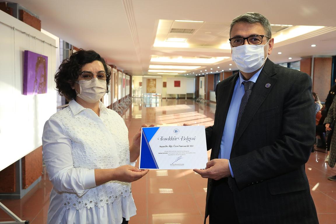 Pamukkale Üniversitesi Denizli Teknik Bilimler Meslek Yüksekokulu (DTB MYO) Tasarım Bölümü Moda Tasarım Programı Öğretim Üyesi Dr. Öğr. Üyesi Nurcan Kutlu, tekstil sanatı kapsamında portrelerden oluşan çalışmaların yer aldığı “Bellek Portreler isimli kişisel sergisini, PAÜ Prof. Dr. Hüseyin Yılmaz Kongre ve Kültür Merkezi Fuaye Sergi Salonu’nda düzenlenen serginin açılışına, Rektör Prof. Dr. Ahmet Kutluhan, PAÜ Genel Sekreteri Prof. Dr. Mehmet Çiçek ve davetliler katıldı. Serginin açılışını Dr. Öğr. Üyesi Nurcan Kutlu ile birlikte gerçekleştiren Rektör Prof. Dr. Ahmet Kutluhan, serginin hayırlı olmasını dileyerek Dr. Öğr. Üyesi Kutlu’ya teşekkür belgesi takdim etti. Açılışın ardından sergiyi gezen Rektör Prof. Dr. Ahmet Kutluhan ve beraberindekiler eserler ve yapım tekniği hakkında Dr. Öğr. Üyesi Nurcan Kutlu’dan bilgi aldı.