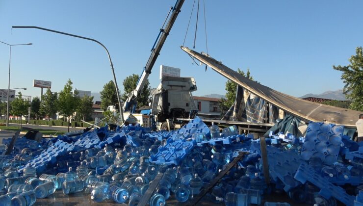 Damacanaların yolu kapattığı kaza anı ise bir iş yerinin güvenlik kamerasına yansıdı. Görüntülerde tırın süratle çarptıktan sonra elektriklerin kesilmesi ve devrilen tırdan damacanaların yere düşmesi yer alıyor.