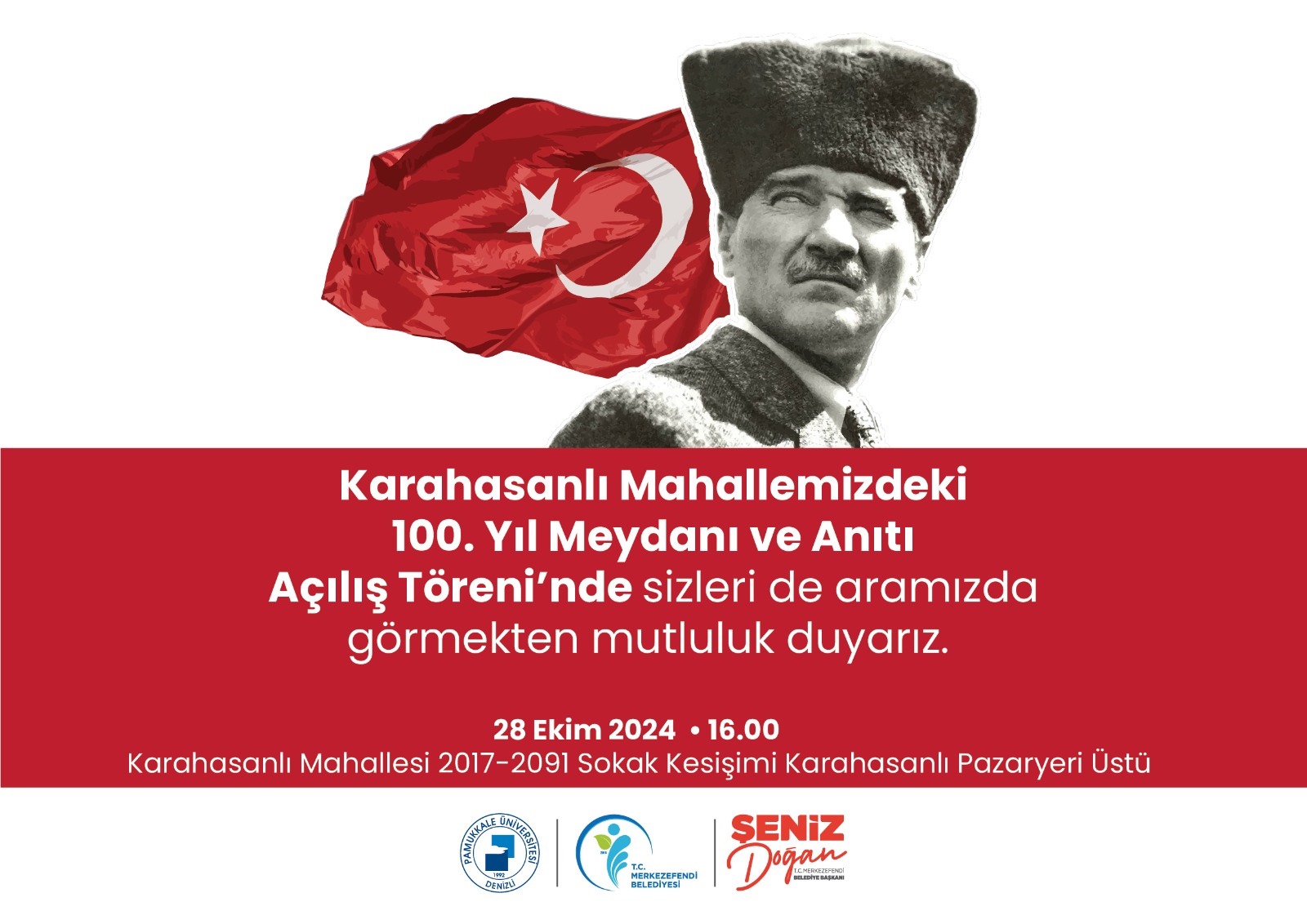 Merkezefendi Belediyesi, ilçe genelindeki çalışmalarına tüm hızıyla devam ediyor. Merkezefendi Belediyesi’nce, Cumhuriyetimizin 101. yılına özel olarak Karahasanlı Mahallesi’ne ‘100. Yıl Meydanı ve Anıtı’ kazandırıldı. Meydanın ve anıtın açılışı, 28 Ekim Pazartesi günü saat 16.00’da Karahasanlı Mahallesi 2017-2091 Sokak Kesişimi Karahasanlı Pazaryeri üstünde gerçekleştirilecek.