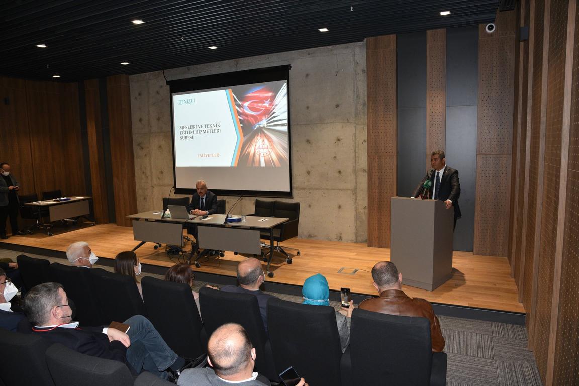 Denizli’de faaliyet gösteren sanayi firması temsilcilerinin katıldığı tanıtım toplantısında İl Milli Eğitim Müdürü Süleyman Ekici Mesleki Eğitim Merkezleri programı hakkında bilgiler verdi. Ekici, yaptığı konuşmasında “Değerli sanayicilerimiz, iş dünyamız ve hayırseverlerimiz Mesleki Eğitim Merkezi Programı tanıtımı için sizlerle bir araya geldik. Dünya 2020 yılında korona virüs ile pandemi sürecine girdi. Eğitim camiası olarak bizlerde yeni hayat düzenine uyum ve eğitimin aksamaması adına çalışmalar yaparak eğitim-öğretime devam ettik. 2021 yılı yaz döneminde yaptığımız çalışmalarla da 6 Eylül’de yüz yüze eğitime başladık. Kasım-Aralık 2021 aylarında ilimizde de kütüphanesi olmayan 131 okulumuzu kütüphaneye kavuşturduk. Tüm bu okullarda kütüphane malzemelerini yine meslek liselerimiz üretti. Bundan sonraki süreçte hedefimiz okul kütüphanelerimizi daha da zenginleştirmektir. 2022 yılı sonuna kadar ilimizde 700 bin kitabı kütüphanelerimiz envanterine katmak istiyoruz. Bu hedefimize de yerel yönetimlerimiz, meslek odalarımız, sivil toplum kuruluşlarımız ve hayırseverlerimizle ulaşmak istiyoruz” dedi.