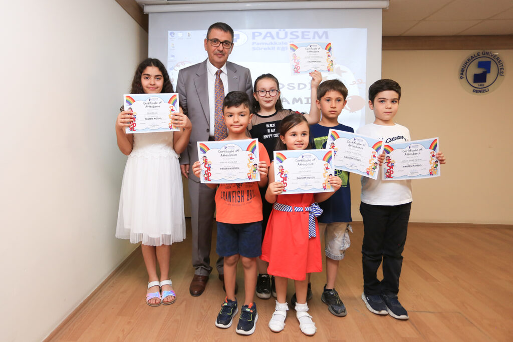 Pamukkale Üniversitesi Sürekli Eğitim Merkezi (PAÜSEM), 5-6; 7-8; ve 9-10 yaş gruplarında, Çocuklar İçin İngilizce Eğitimi (KidsDil) programını geçtiğimiz yılın Aralık ayında başlatmıştı. Oyunlar, çeşitli aktiviteler ve şarkılar yoluyla İngilizceyi yaşayarak ve konuşarak öğretmeyi hedefleyen dil eğitimi programında, çocukların iletişim odaklı olarak, İngilizce okuma ve yazma becerilerinin de geliştirilmesi amaçlandı. Farklı yaş gruplarında 48 ve 60 saat İngilizce eğitimi alan çocuklara sertifikaları düzenlenen tören ile takdim edildi. Eğitim Fakültesi Engin Aksel Konferans Salonunda düzenlenen sertifika takdim törenine Rektör Prof. Dr. Ahmet Kutluhan, Rektör Yardımcısı Prof. Dr. Bilal Söğüt, Eğitim Fakültesi Dekanı Prof. Dr. İzzet Kara, İktisadi ve İdari Bilimler Fakültesi Dekanı Prof. Dr. M. Ensar Yeşilyurt, PAÜSEM Müdürü Doç. Dr. Yasin Doğan, öğretim üyeleri, kursiyer öğrenciler ve aileleri katıldı.