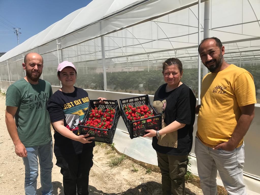 Eşi ile birlikte yoğun ve yorucu bir dönem geçirdiklerini belirten elektronik mühendisi Hakan Sezmiş ise“İşletmemizde otomatik sistem sulama yapıyoruz. Şu anda altı buçuk dönüm kapalı seramızda yüz on bin fidemizden, fide başına yaklaşık beş yüz gram çilek yetiştiriyoruz. Biz burada topraksız üretim yaparken kullandığımız tarım ilaçlarının çilek üretimine uygunluğuna bakarak kullanıyoruz. Lisanslı fide kullanıyoruz. Raf sisteminde tek sıra raf üzerine kurduk. Daha fazla güneş ışığından faydalanmasını sağladık. Üretimden çok memnunuz” diye konuştu.