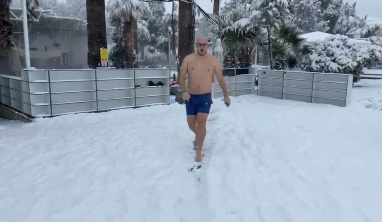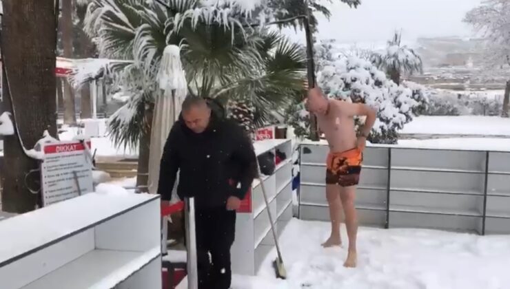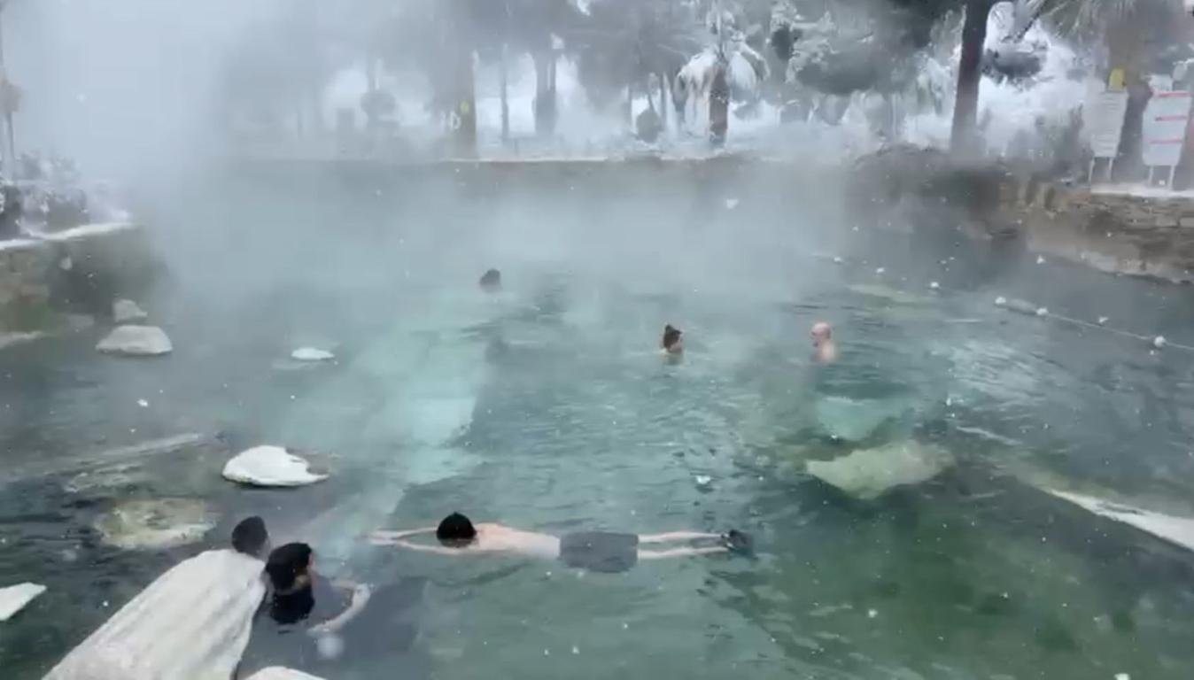 Denizli’de dün akşam saatlerinden bu yana etkili olan yoğun kar yağışı, UNESCO Dünya Mirası Listesi’nde yer alan travertenleriyle ünlü Pamukkale’yi de beyaz örtüyle kapladı. Beyaz cenneti ziyaret eden yabancı turistler, eksi 6 dereye kadar düşen hava sıcaklığı ve kar yağışına rağmen milattan önce 2. yüzyıldan kalan Hierapolis kentindeki antik Kleopatra Havuzuna girmeyi ihmal etmedi. Soğuk ve yağışa aldırmayan turistler, 36 derece su sıcaklığına sahip olan ve içinde tarihi eseri barındıran antik havuzda yüzmenin keyfini çıkardı.