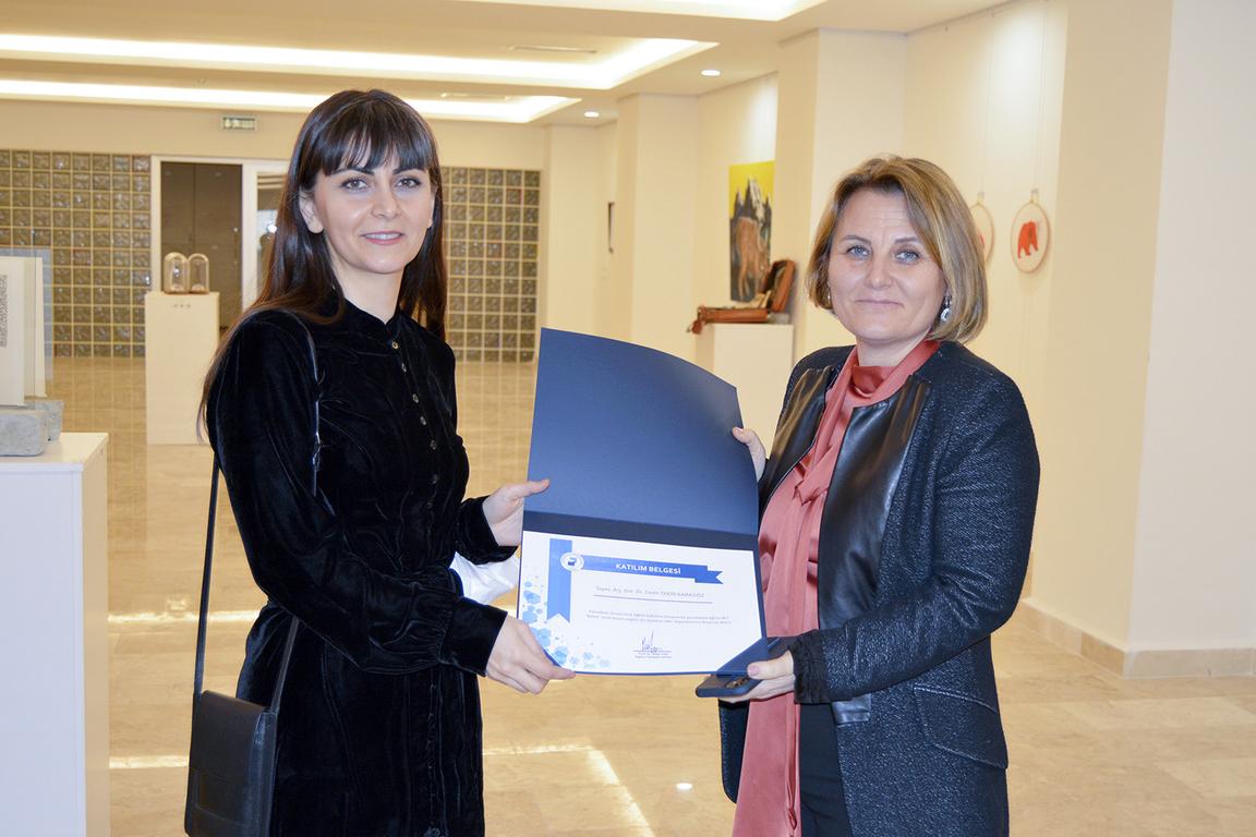 Sergi hakkında bilgi alan ve eserleri yakından inceleyen Eğitim Fakültesi Dekanı Prof. Dr. Bilge Can, katkılarından dolayı Arş. Gör. Dr. Ceren Tekin Karagöz’ü kutlayarak, teşekkür belgesi takdim etti.