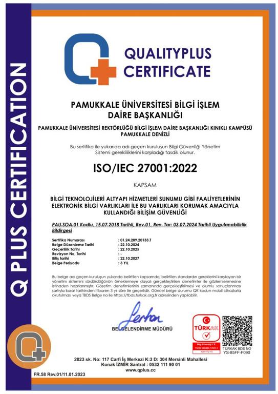 Pamukkale Üniversitesi (PAÜ) Bilgi İşlem Daire Başkanlığı, bilgi güvenliği denetimlerini başarı ile tamamlayarak Uluslararası ISO 27001:2022 Belgesi almaya hak kazandı.
