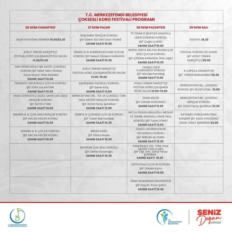 Merkezefendi Belediyesi çoksesli koro müziğini özendirmek ve Türk müziğinin evrensel boyuta ulaşmasına katkı sağlamak için ilk kez Ulusal düzeyde ‘T.C. Merkezefendi Belediyesi Çoksesli Korolar Festivali’ düzenleyecek. Dört gün boyunca sürecek olan festival 26 Ekim’de başlıyor.