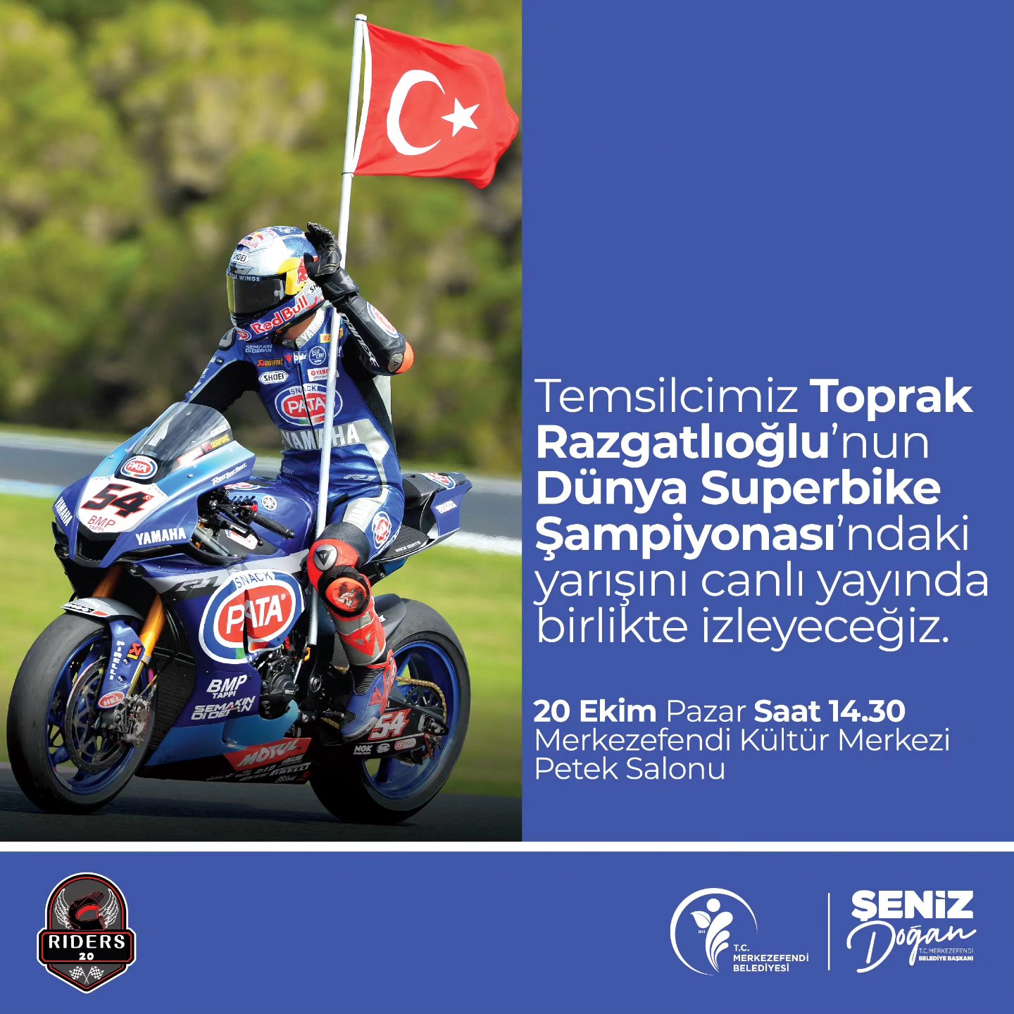Spora ve sporcuya her zaman destek olan Merkezefendi Belediyesi, çalışmalarına tüm hızıyla devam ediyor. Merkezefendi Belediyesi tarafından, Türk dünya şampiyonu motosiklet yarışçısı Toprak Razgatlıoğlu’nun Dünya Superbike Şampiyonası’ndaki yarışı canlı yayında verilecek. Motor tutkunları yarış boyunca ekranlarda İspanya Jerez Pisti’nde Razgatlıoğlu’nun mücadelesini canlı olarak takip edebilecek.