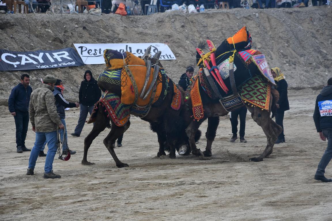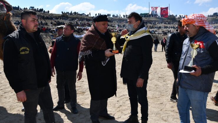 Renkli görüntülere sahne olan güreşlerde dereceye giren deve sahiplerine kupalarını protokol üyeleri takdim etti.