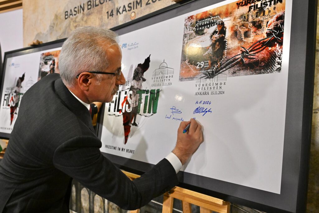 Ulaştırma ve Altyapı Bakanı Abdulkadir Uraloğlu, PTT’nin savaş muhabiri Coşkun Aral’ın çektiği fotoğrafları kullanarak hazırladığı, “Yüreğimde Filistin” konulu anma pullarıyla Gazze’deki soykırıma dikkat çekildiğini kaydederek, “Yarın itibariyle 105 bin tirajlı 1 anma pulu ile 5’er bin tirajlı 3 adet seri numaralı anma pulu, 7 bin 500 adet ilkgün zarfı ve bu ürünlerin içerisinde yer aldığı 5 bin pul portföyünü hem tedavüle hem de sizlerin takdirine sunacağız. Filistin’de yaşanan bu soykırımı asla unutmayacağız, unutturmayacağız. Filistin’i yüreğimizde taşıyacağız.” dedi.